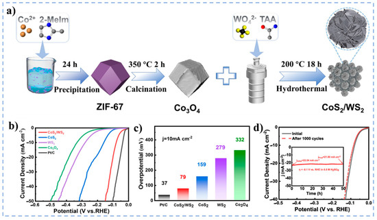 Yao and co-workers prepared MOF-derived CoS2/WS2 composites by the combination of calcination and hydrothermal methods (Figure 7a) [90]. The ZIF-67 was first synthesized using cobalt nitrate hexahydrate and 2-methylimidazole as precursors. The ZIF-67 was then pyrolyzed at high temperature to obtain a Co3O4 framework. Subsequently, the hydrothermal method was employed to simultaneously sulfurize Co3O4 into CoS2 while growing a small amount of WS2 on its surface, forming the CoS2/WS2 composites. The fabricated CoS2/WS2 composites exhibited significantly superior hydrogen evolution performance compared to the other control samples (Figure 7b,c). Moreover, it also exhibits remarkable long-term durability for HER (Figure 7d). The catalyst was subjected to 1000 cycles at a scan rate of 5 mV s−1 in 0.5 M H2SO4. The post-cycling LSV curve nearly overlapped with the initial one, with only a 6 mV increase in overpotential at 10 mA cm−2. Furthermore, after a 50 h HER stability test at a fixed overpotential of 100 mV, the CoS2/WS2 electrode retained 92.61% of its initial current density. The flower-like CoS2/WS2 composites exhibited outstanding electrocatalytic activity and stability in acidic media due to two factors: (1) its large specific surface area, which provides more active sites, and (2) enhanced electrical conductivity, which facilitates charge transfer.