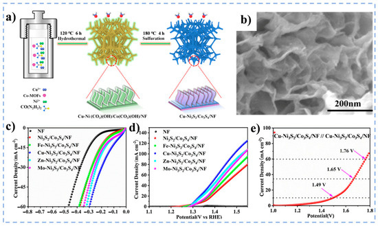 (a) Schematic of the design process of M (M = Fe, Cu, Zn, Mo)-Ni3S2/Co3S4/NF nanosheets (taking Cu doping as an example), (b) SEM images of Cu-Ni3S2/Co3S4 composites, (c) polarization curves of the fabricated M (M = Fe, Cu, Zn, Mo)-Ni3S2/Co3S4/NF composites, (d) polarization curves of the fabricated M (M = Fe, Cu, Zn, Mo)-Ni3S2/Co3S4/NF composites, (e) polarization curves of Cu-Ni3S2/Co3S4 toward overall water splitting [108]. Copyright 2021, Elsevier.