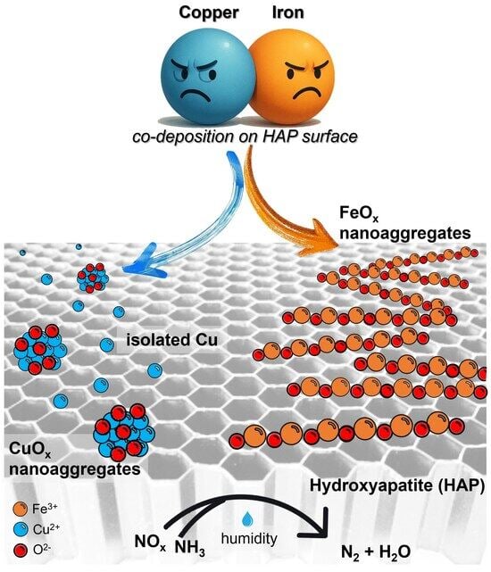 Galloni MG, Zhang W, Giroir-Fendler A, Campisi S, Gervasini A. Exploring the Evolution of Co-Deposited Copper and Iron Nanostructures on Hydroxyapatite: Implications in NH3-SCR Reaction. Catalysts. 2025; 15(10):929. https://doi.org/10.3390/catal15100929