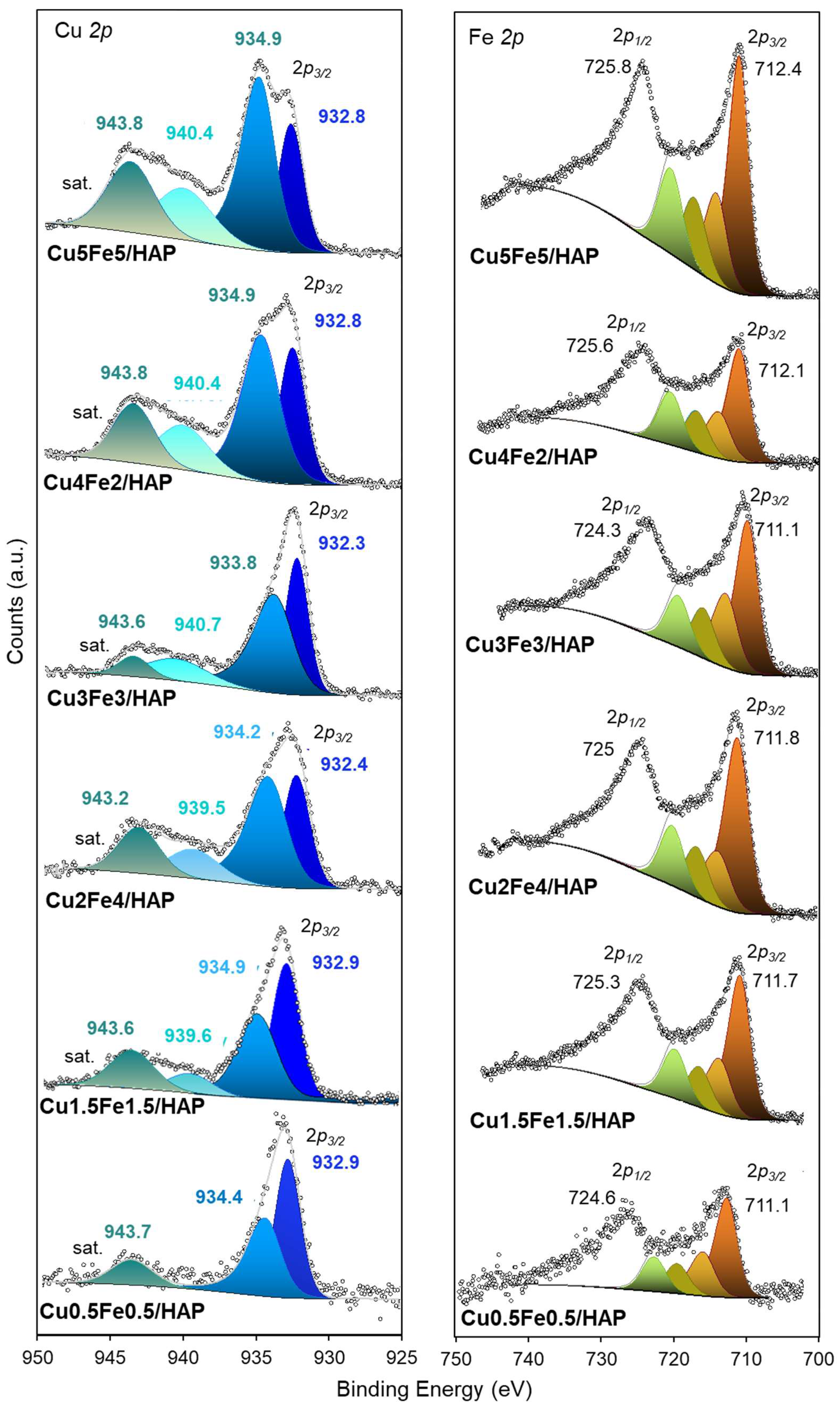 Cu5Fe5/HAP | 73 | 5.28 ± 0.04 | 5.21 ± 0.04 | 2.36 | 3.6 (8.9 wt.%) | 6.5 (14 wt.%) | 1.0 |