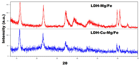 2.1. Characterization of LDH-Mg/Fe and LDH-Cu-Mg/Fe