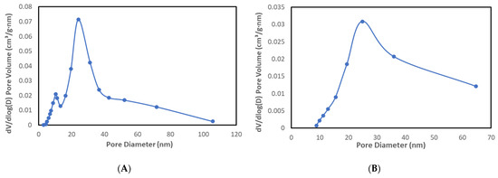The Barrett–Joyner–Halenda (BJH) pore size distribution curves revealed a mesoporous structure centered at ~24 nm for both samples. The pristine material exhibited a maximum of 0.071 cm3/g·nm at 24.04 nm (Figure 3A) and a wide distribution extending up to 105 nm. At the same time, the Cu(II)-loaded sample showed a maximum at 24.84 nm with a significantly lower intensity (0.030 cm3/g·nm) (Figure 3B) and a narrower distribution (up to 64.7 nm). These results indicate that the mesoporous framework is preserved after Cu(II) adsorption, but a considerable fraction of the pores becomes partially blocked, decreasing the accessible pore volume.