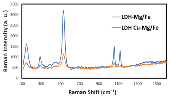 Raman spectra of LDH-Mg/Fe (blue) and LDH-Cu-Mg/Fe (orange).