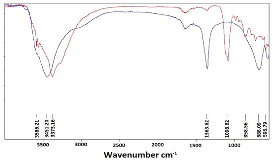 Figure 7 shows a comparison of the Fourier Transformed-Infrared (FT-IR) spectra for LDH-Mg/Fe and LDH-Cu-Mg/Fe materials. A new band between 1145 and 1115 cm−1 is observed in the recovered material, consistent with the adsorption of Cu(II) on the LDH-Mg/Fe surface. Typical bands for double-layered materials were also identified: 3405 cm−1 for O–H stretching, 1400–880 cm−1 for carbonate stretching vibrations, and 590–667 cm−1 for M–O and O–M–O vibrations [27]. The spectra were recorded using the ATR technique with a Bruker Alpha II spectrometer, (Bruker Optik GmbH, Ettlingen, Germany).