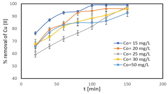 The contact time between the adsorbent material and the contaminated aqueous solution is a fundamental factor for achieving optimal removal efficiency. This is illustrated in Figure 8, where it can be observed that for all tested Cu(II) concentrations, at least 60% of the initial concentration is removed within the first 20 min. The maximum removal of Cu(II) by LDH-Mg/Fe occurs within 2 h, achieving a 92% removal rate. The LDH-Mg/Fe exhibited a fast initial uptake of Cu(II), reaching over 60% removal within 20 min.