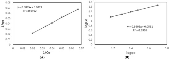 Linearized form for (A) Langmuir model and (B) the Freundlich model.