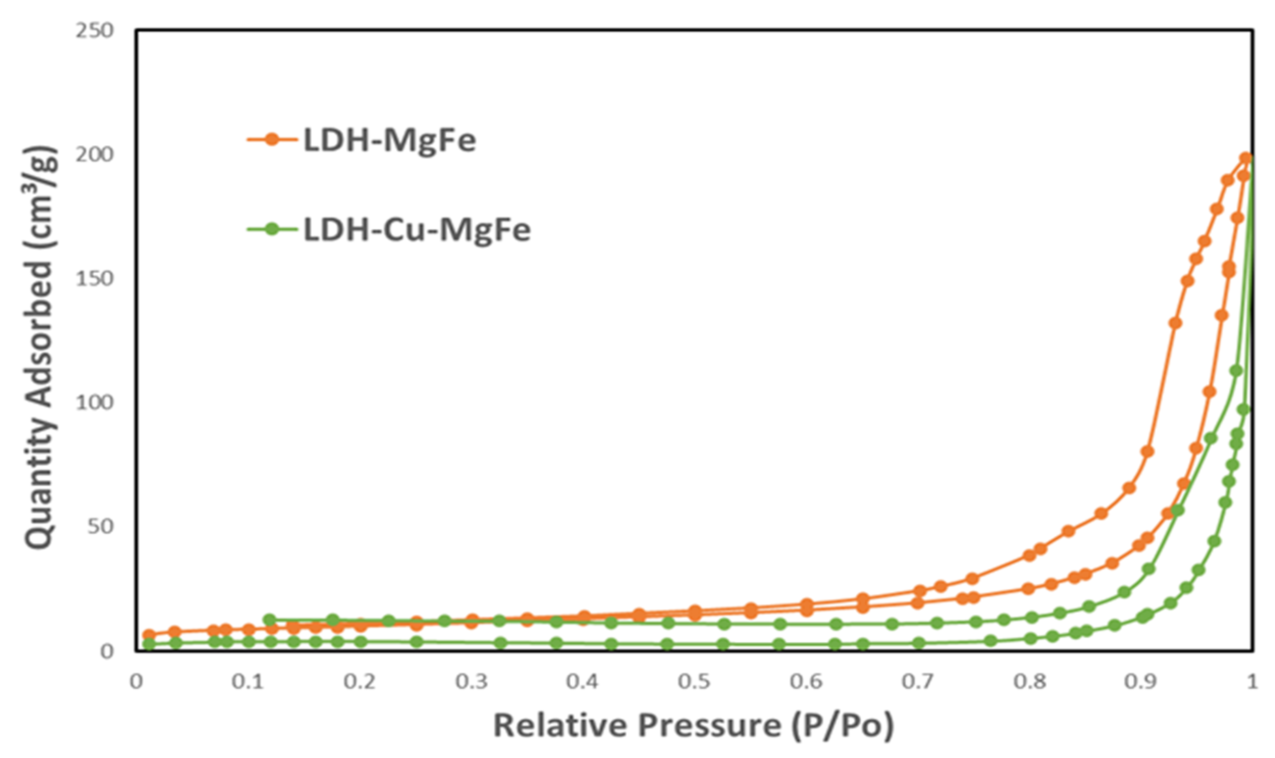 2.1. Characterization of LDH-Mg/Fe and LDH-Cu-Mg/Fe