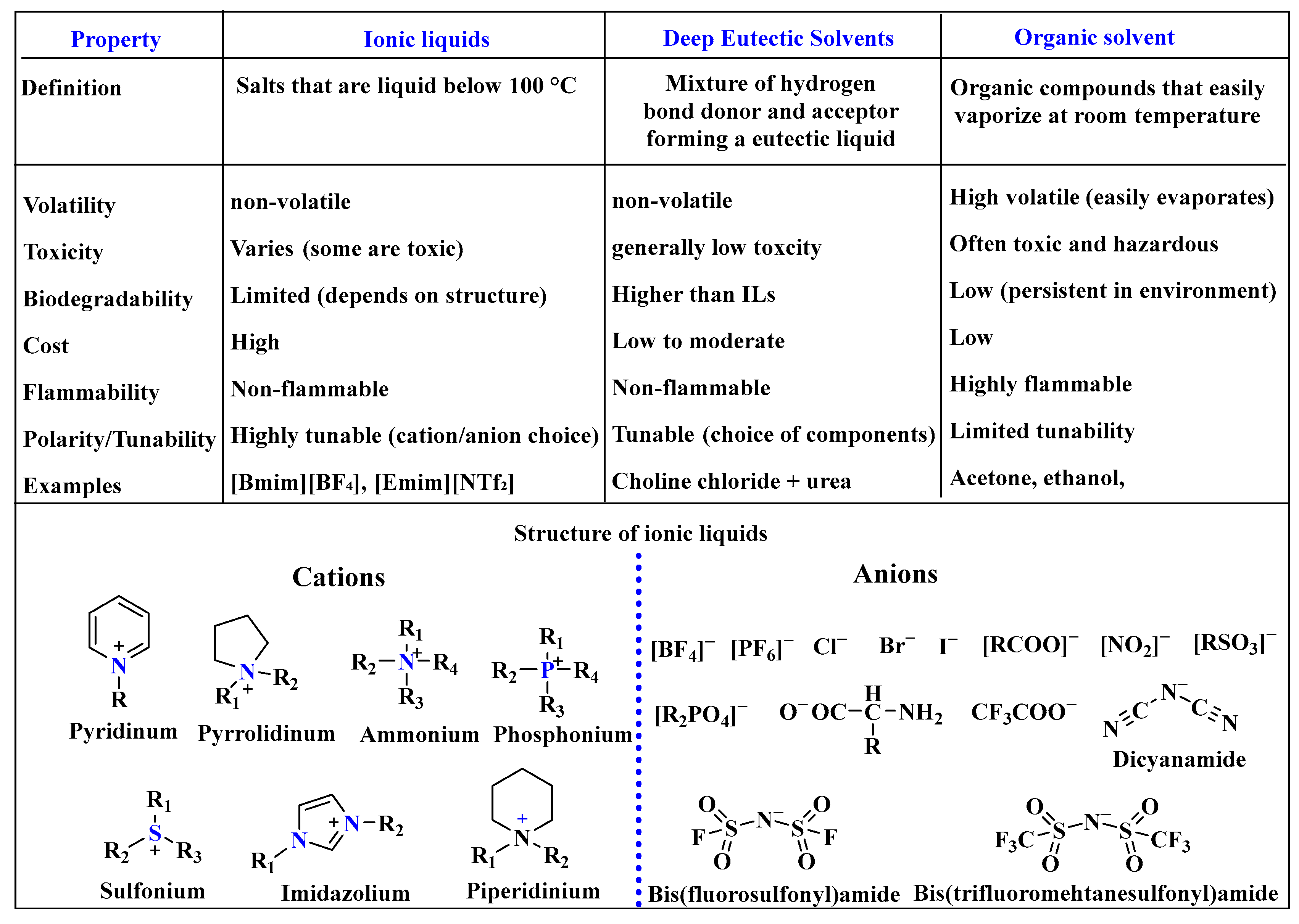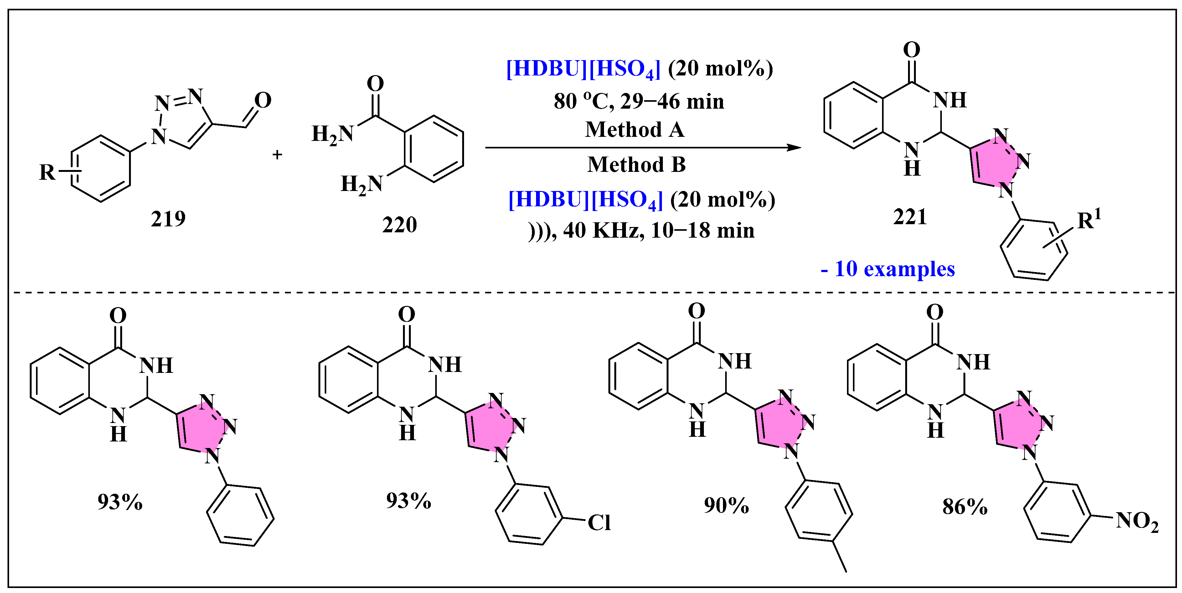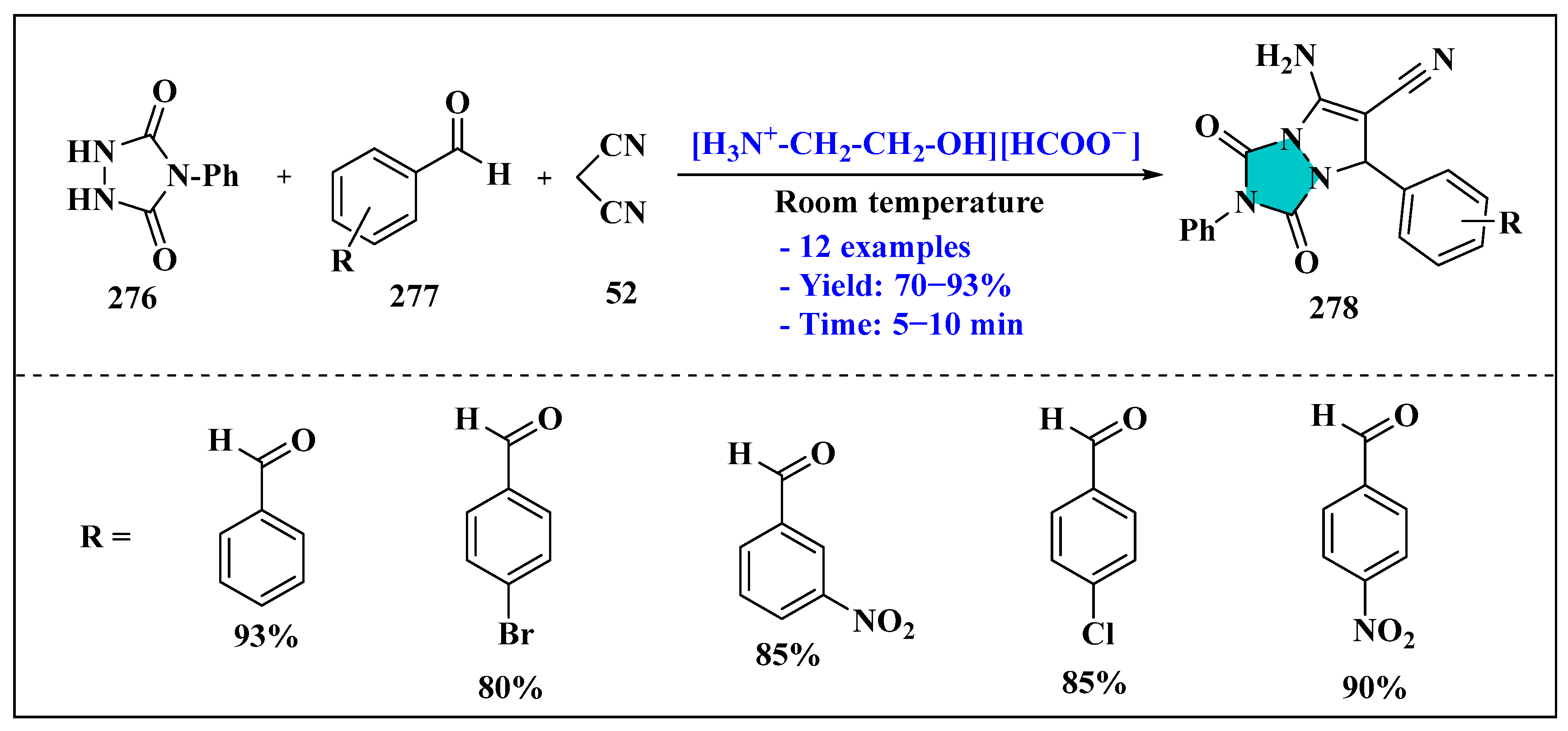- Mishra, B.B.; Kumar, D.; Singh, A.S.; Tripathi, R.P.; Tiwari, V.K. Ionic liquids-prompted synthesis of biologically relevant five-and six-membered heterocyclic skeletons: An update. In Green Synthetic Approaches for Biologically Relevant Heterocycles; Elsevier: Amsterdam, The Netherlands, 2025; pp. 437–493. [Google Scholar] [CrossRef]