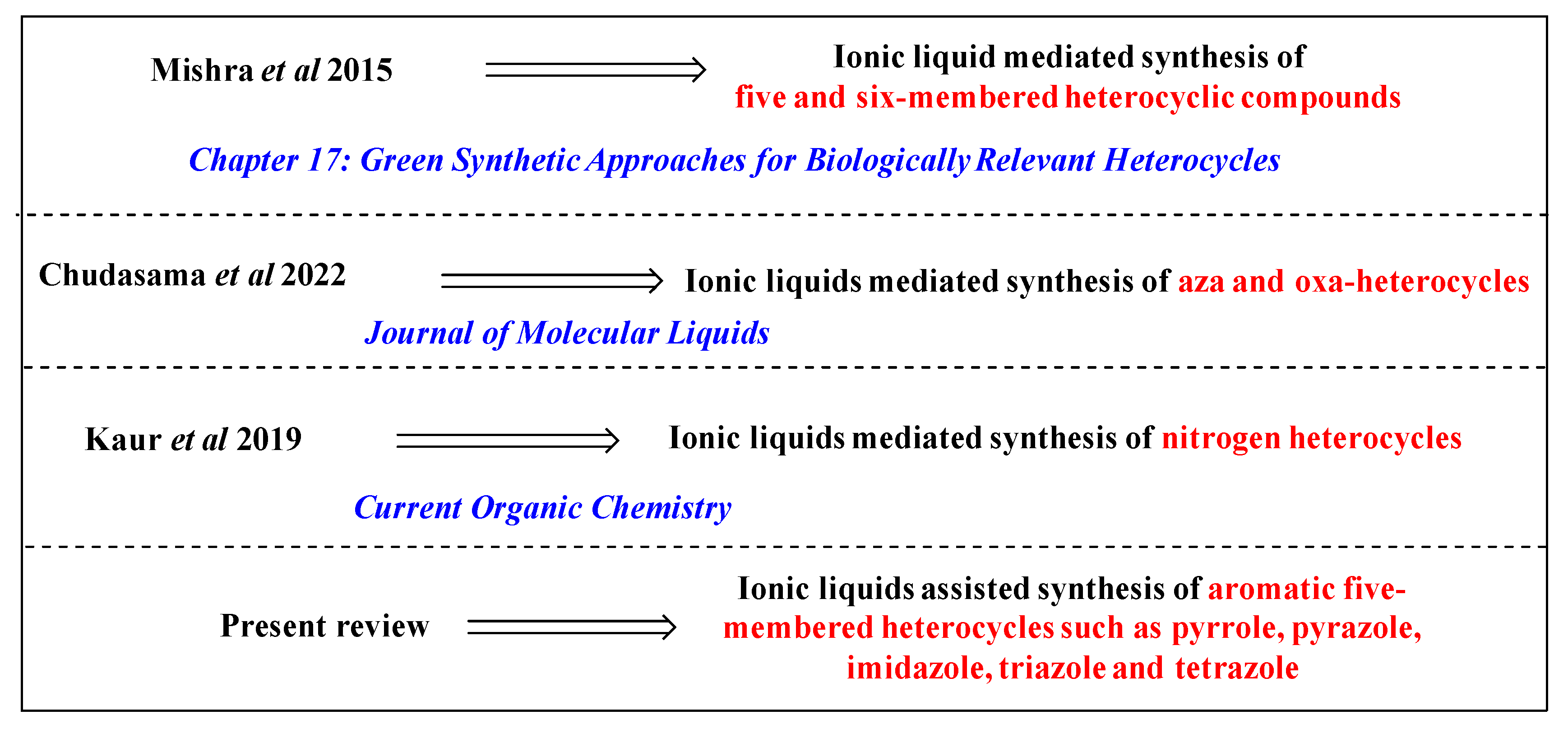 - Kaur, N.; Bhardwaj, P.; Devi, M.; Verma, Y.; Ahlawat, N.; Grewal, P. Ionic liquids for the synthesis of five-membered N,N-, N,N,N- and N,N,N,N-heterocycles. Curr. Org. Chem. 2019, 23, 1214–1238. [Google Scholar] [CrossRef]
