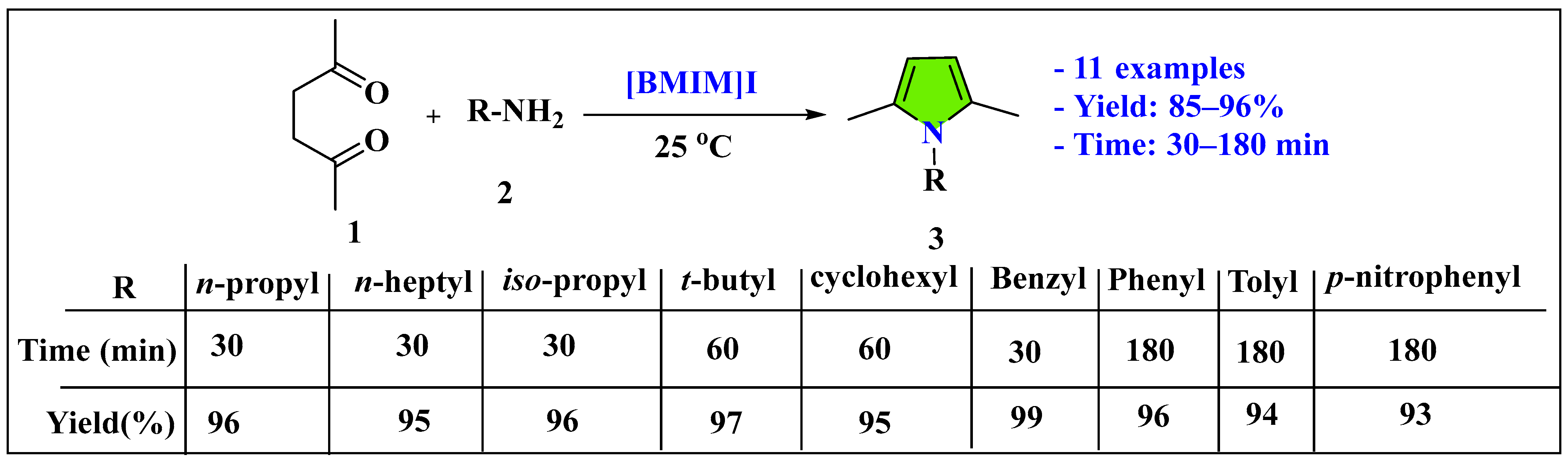 3.1.1. Ionic Liquids Mediated Paal–Knorr Reaction in the Homogenous Phase