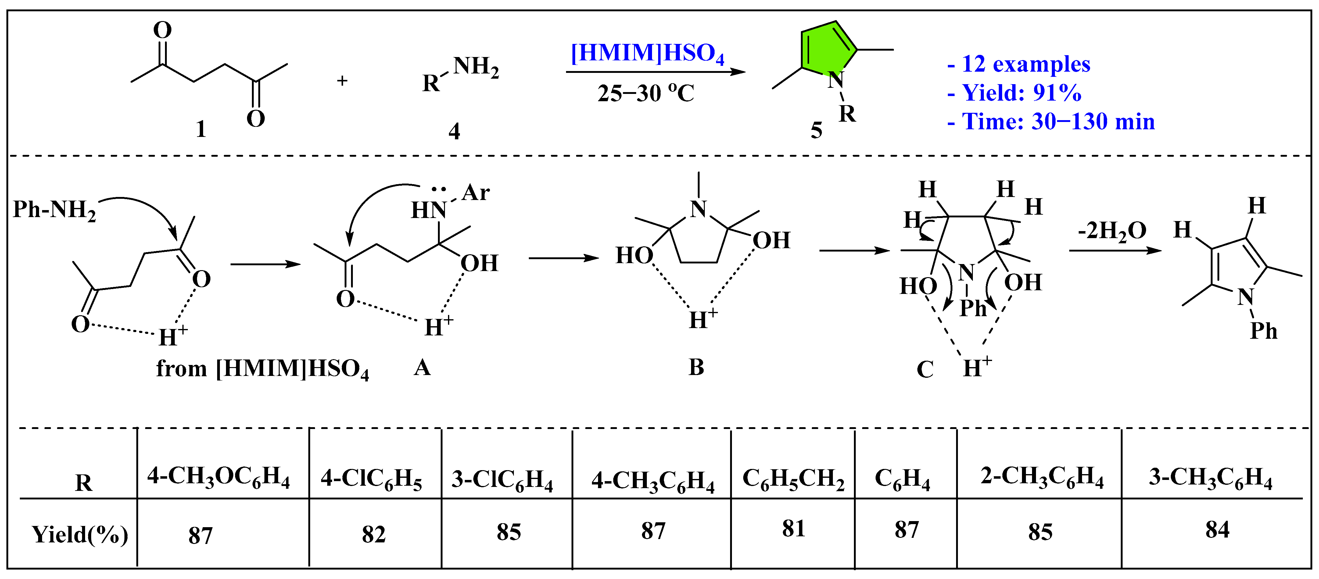 - Li, D.; Zang, H.; Wu, C.; Yu, N. 1-Methylimidazolium hydrogen sulfate catalyzed convenient synthesis of 2,5-dimethyl-N-substituted pyrroles under ultrasonic irradiation. Ultrason. Sonochem. 2013, 20, 1144–1148. [Google Scholar] [CrossRef]