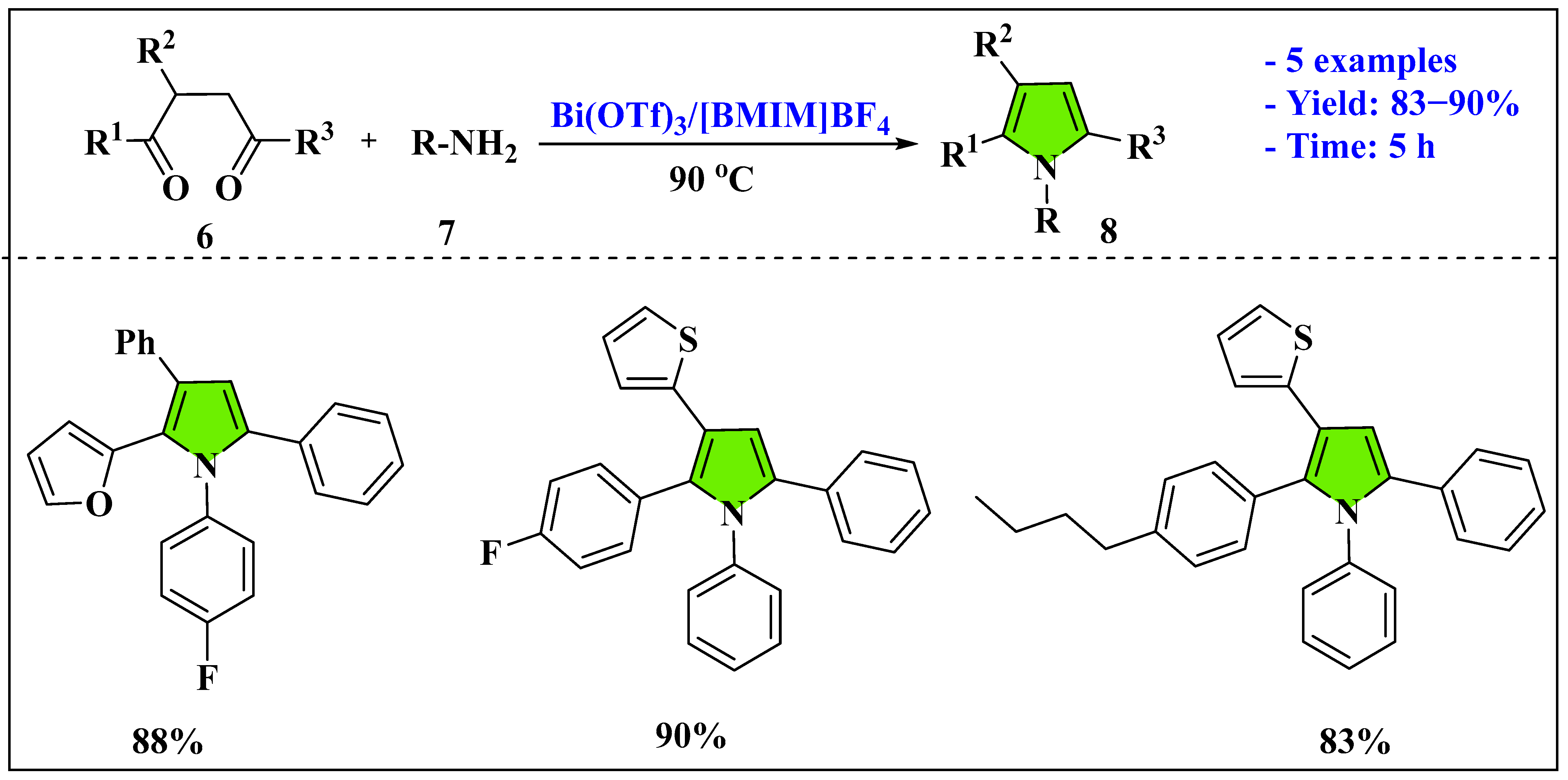 3.1.2. Ionic Liquids Mediated Paal–Knorr Reaction in Heterogeneous Phase