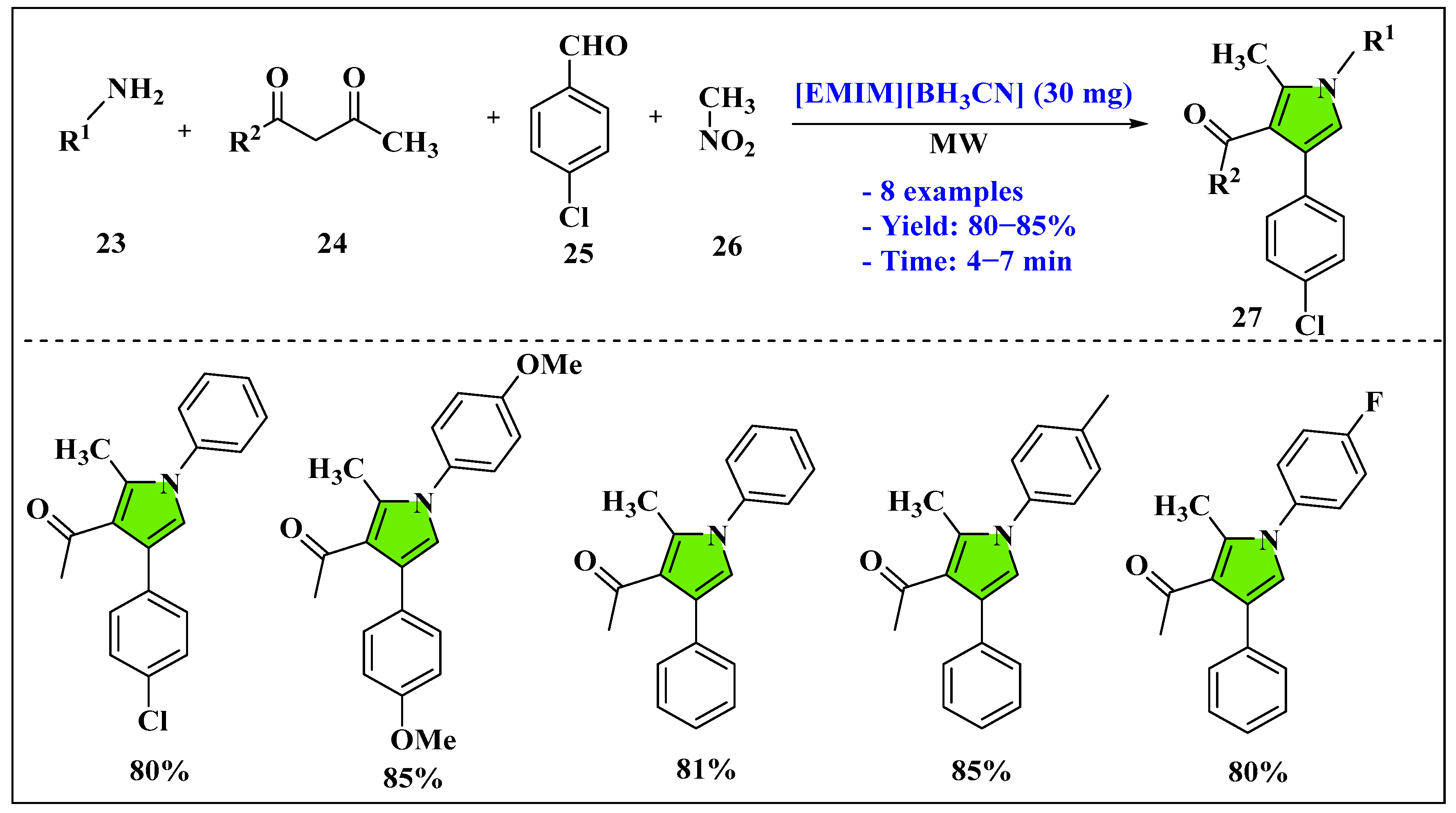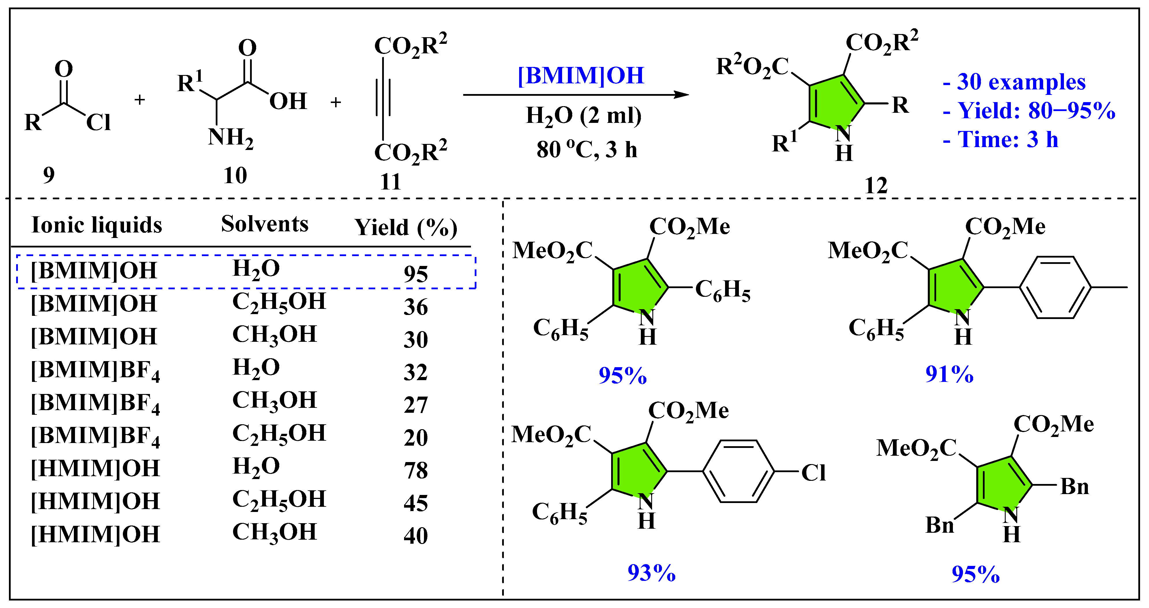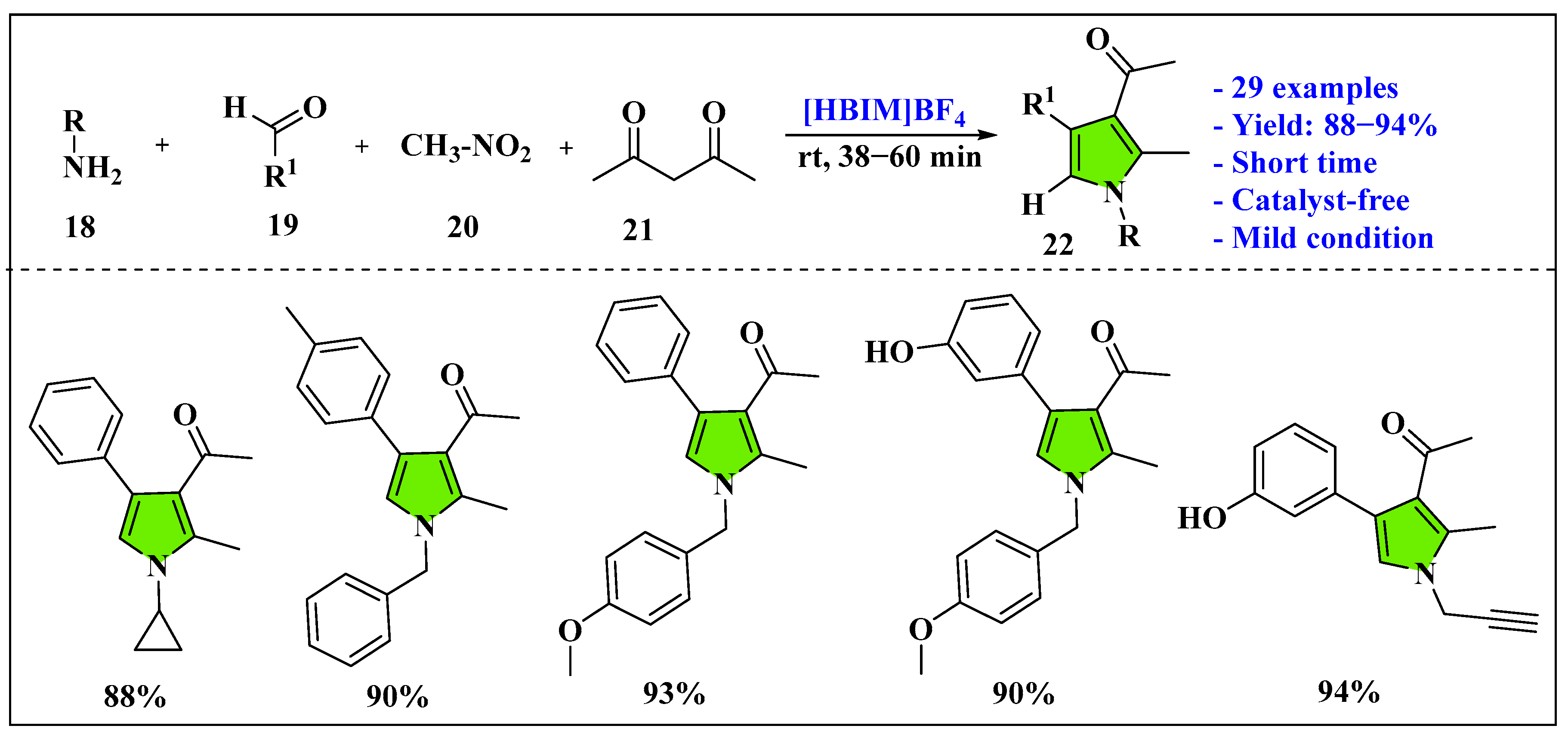 3.1.3. Ionic Liquids Mediated Multicomponent Reaction for Pyrrole Synthesis in Homogenous Phase