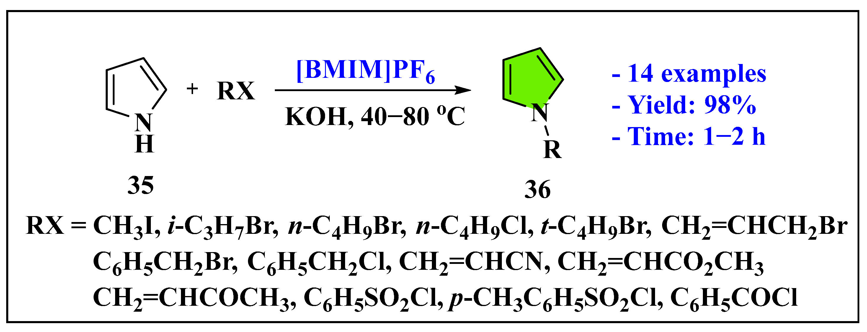 - Le, Z.G.; Chen, Z.C.; Hu, Y.; Zheng, Q.G. Organic reactions in ionic liquids: A simple and highly regioselective N-substitution of pyrrole. Synthesis 2004, 2004, 1951–1954. [Google Scholar] [CrossRef]