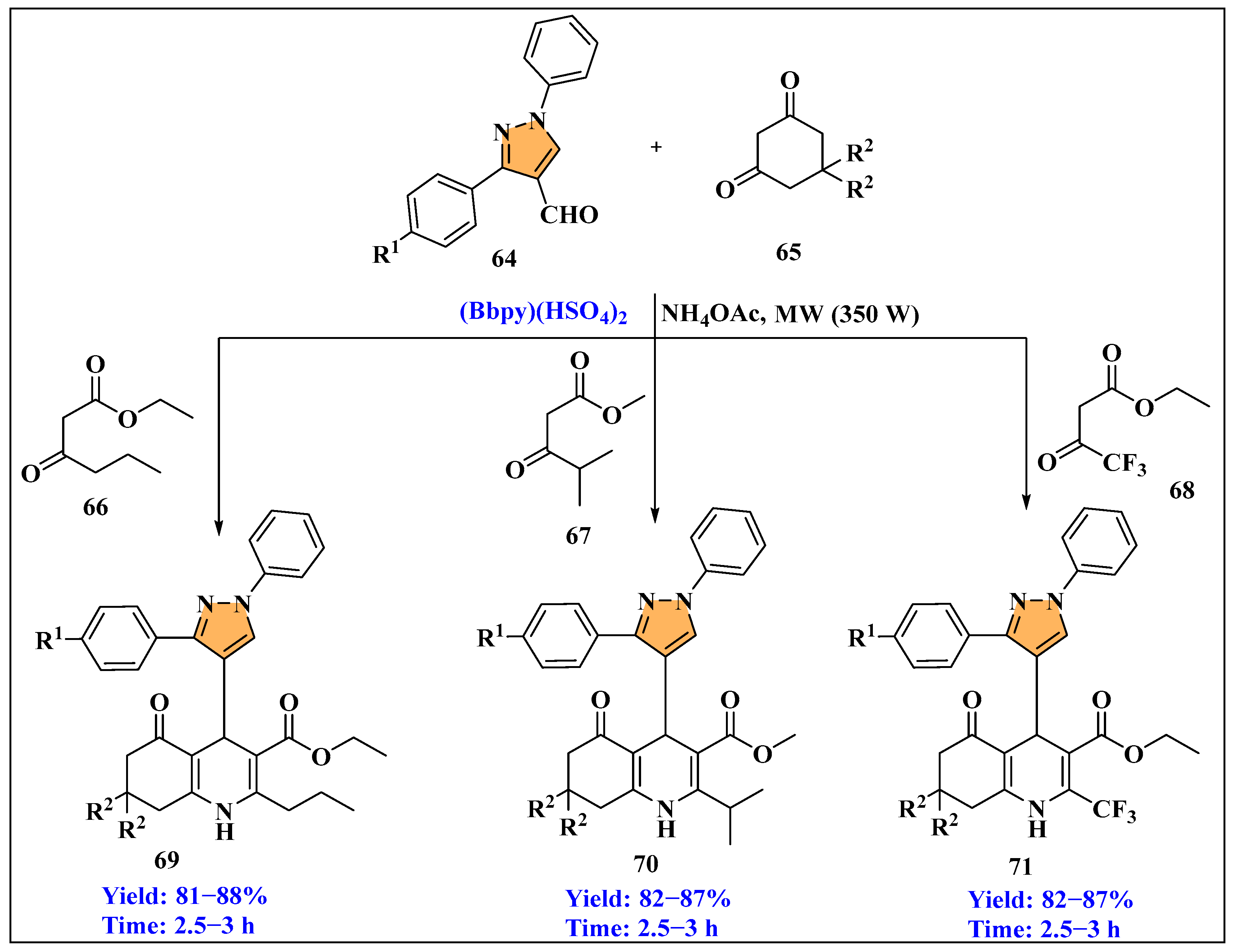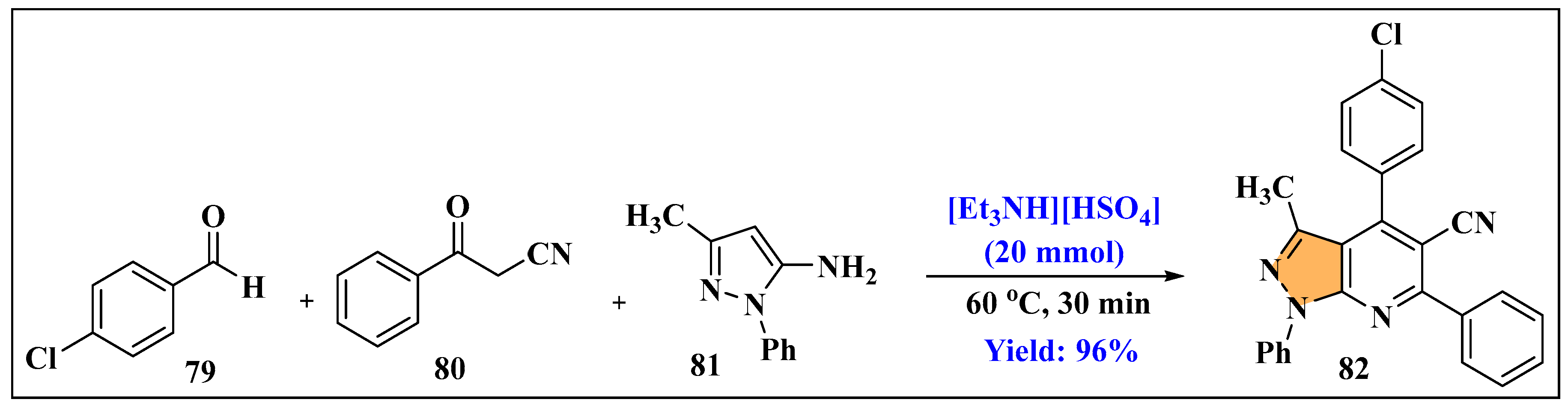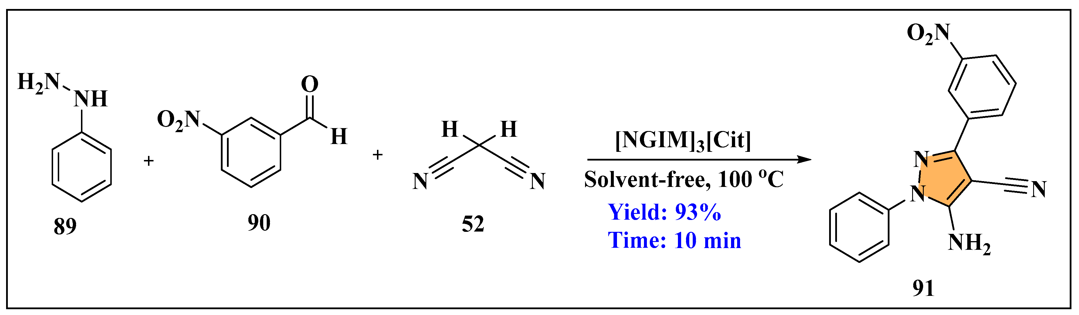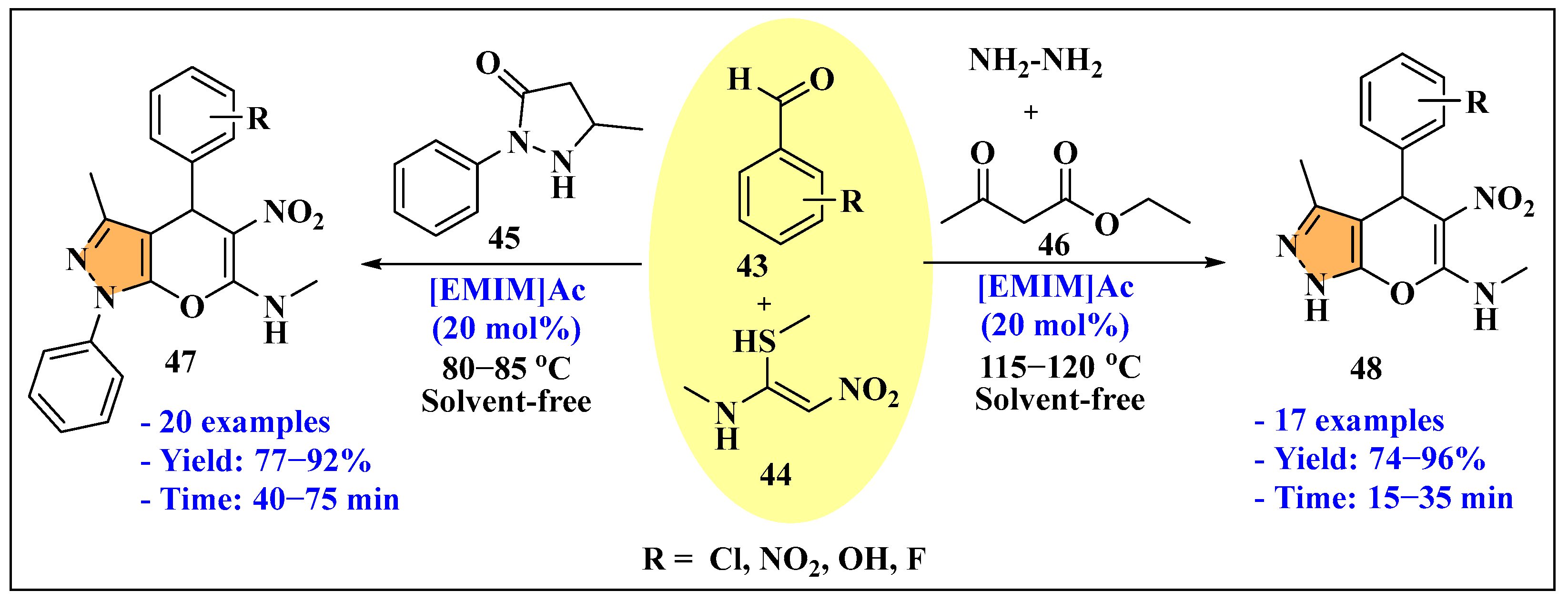 - Sharma, S.; Sharma, P.; Budhalakoti, B.; Kumar, A.; Singh, K.; Kumar Kamboj, R.; Bhatrola, K. Exploring the Impact of Ionic Liquids on Pyrazole Derivatives Synthesis: A Critical Review. ChemistrySelect 2024, 9, 202401925. [Google Scholar] [CrossRef]