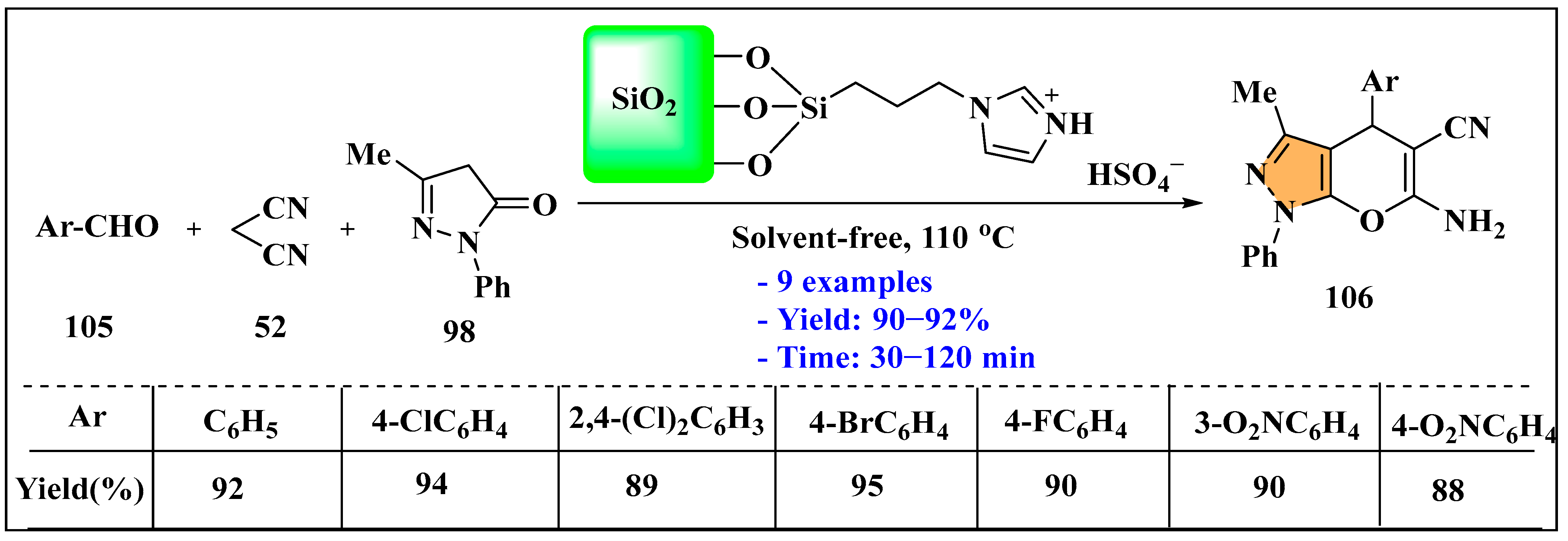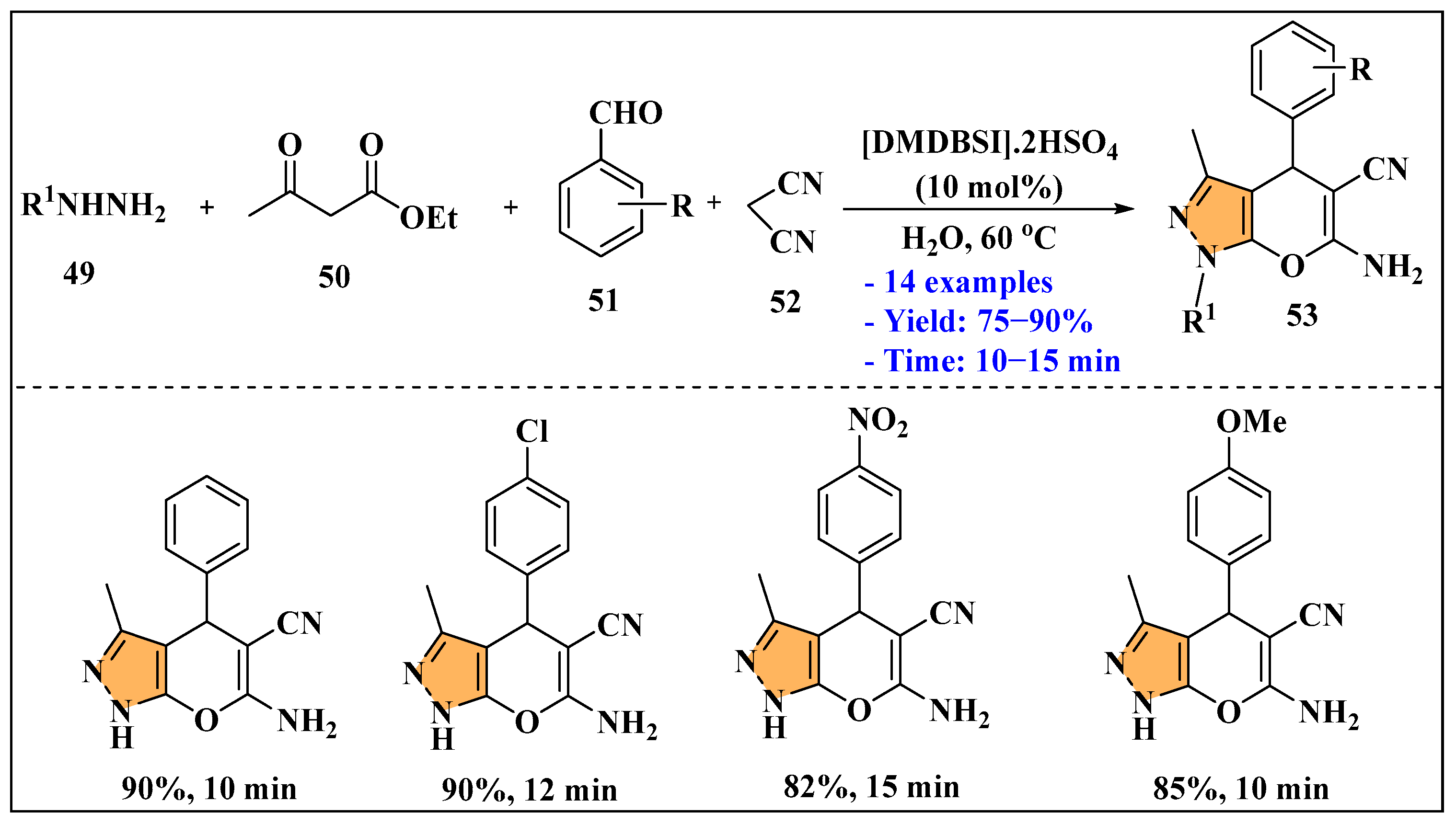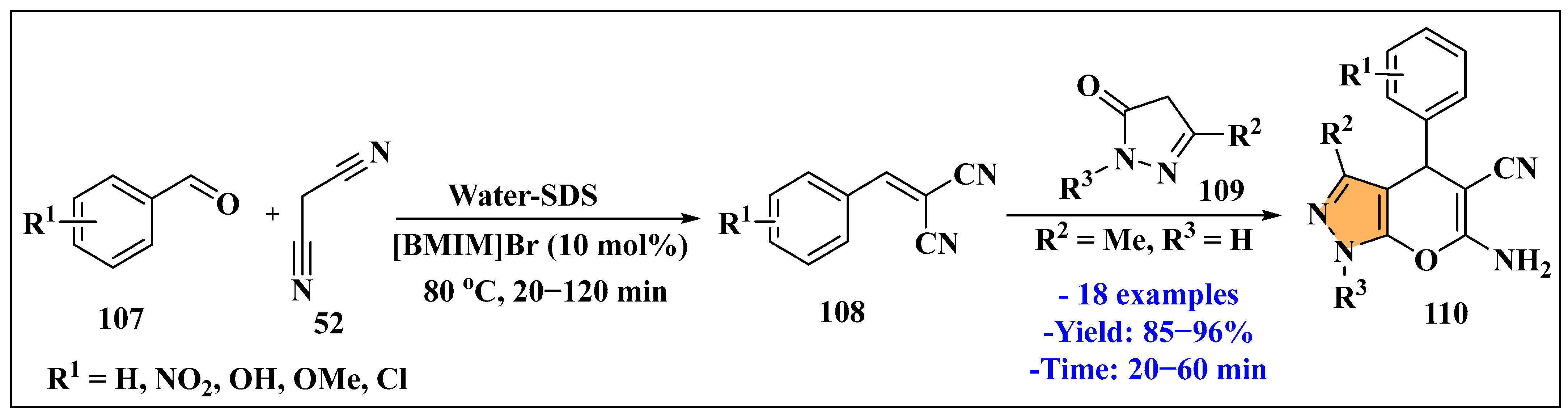 - Katariya, A.P.; Shirsath, P.D.; Narode, H.; Gaikwad, P.B.; Kadam, G.G.; Katariya, M.V.; Deshmukh, S.U. Unraveling the access to the regioselective synthesis of highly functionalized pyranopyrazoles using an ionic liquid catalyst. Mol. Divers. 2023, 27, 2633–2649. [Google Scholar] [CrossRef]