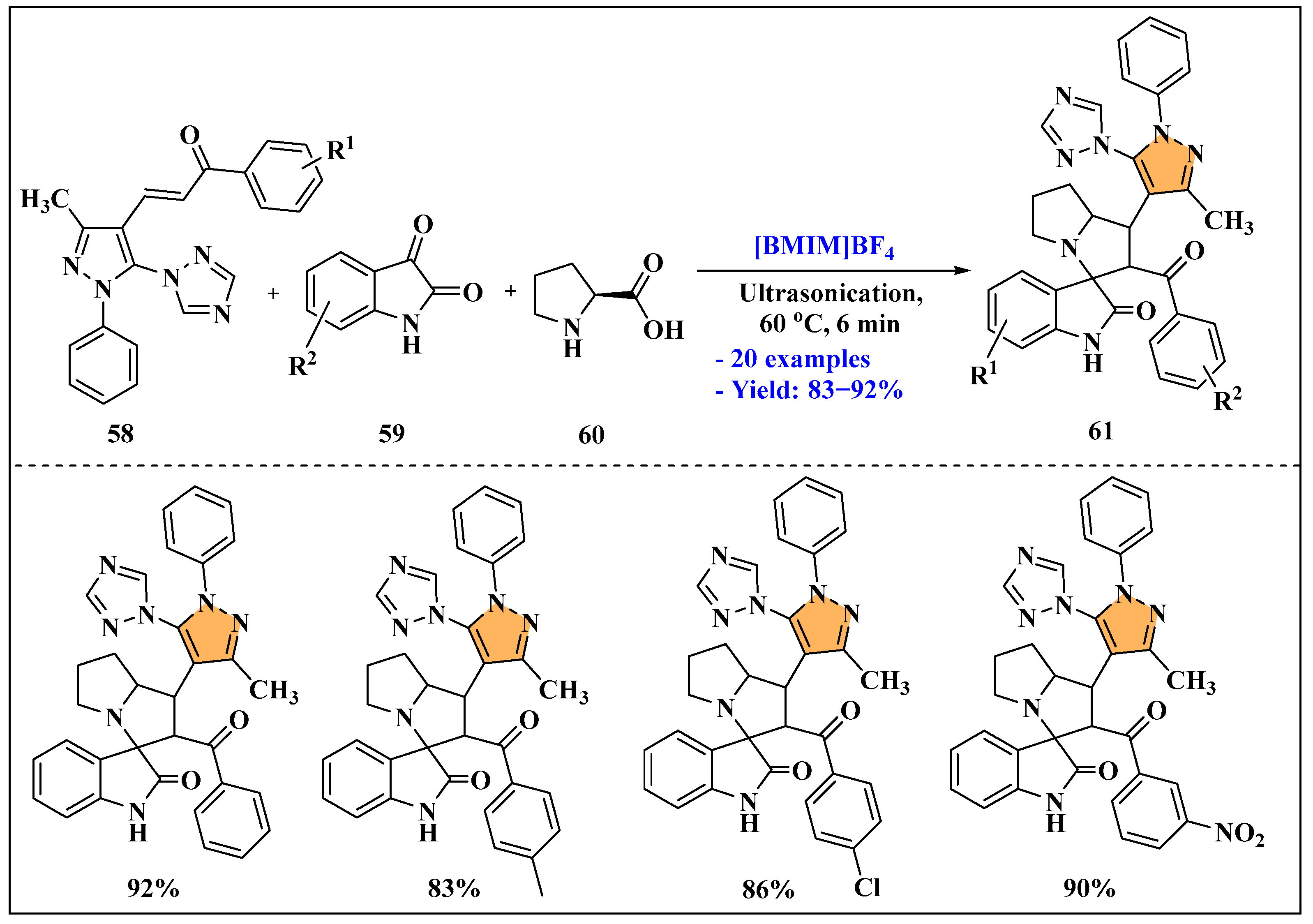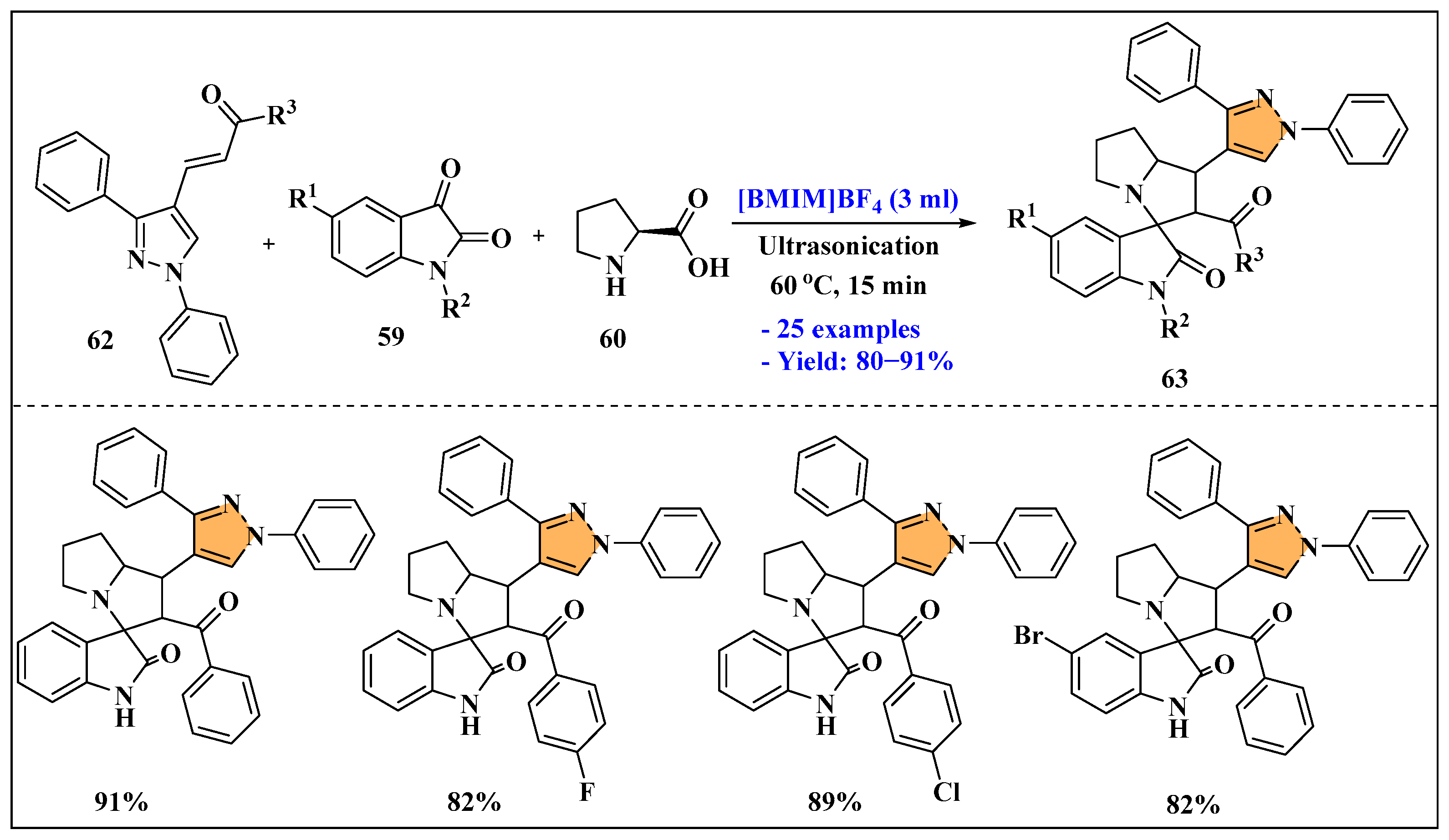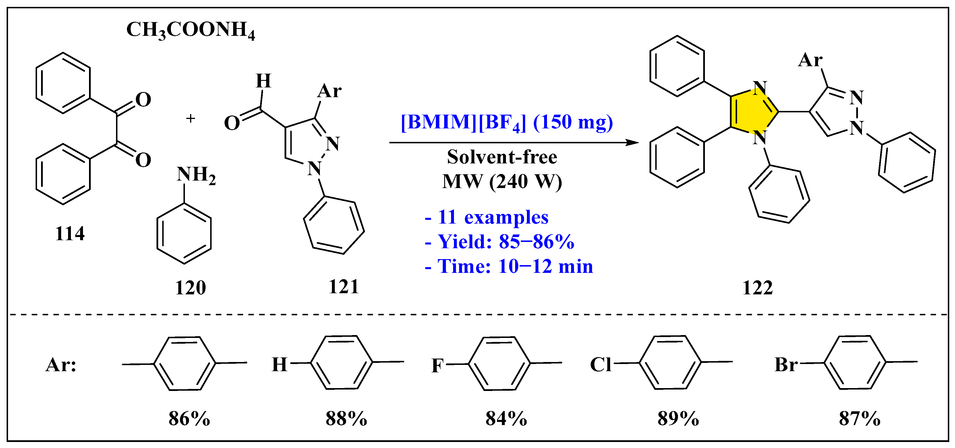 3.2.3. Ionic Liquids Mediated Functionalization of Pyrazole in Homogeneous Phase