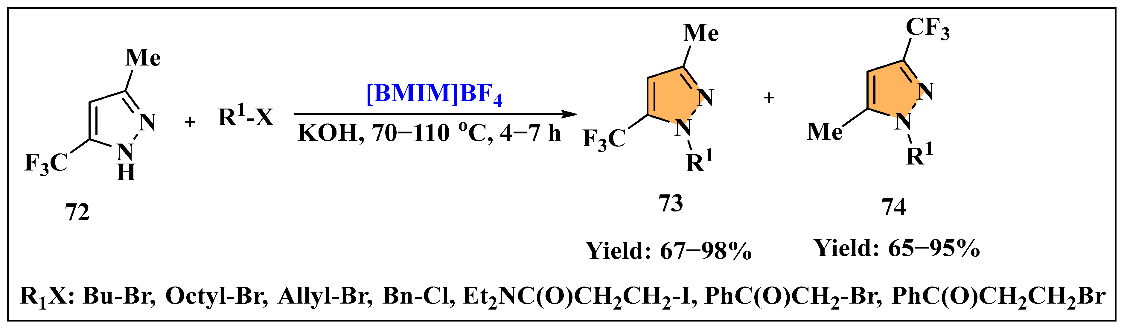 - Buriol, L.; Frizzo, C.P.; Prola, L.D.; Moreira, D.N.; Marzari, M.R.; Scapin, E.; Zanatta, N.; Bonacorso, H.G.; Martins, M.A. Synergic effects of ionic liquid and microwave irradiation in promoting trifluoromethylpyrazole synthesis. Catal. Lett. 2011, 141, 1130–1135. [Google Scholar] [CrossRef]