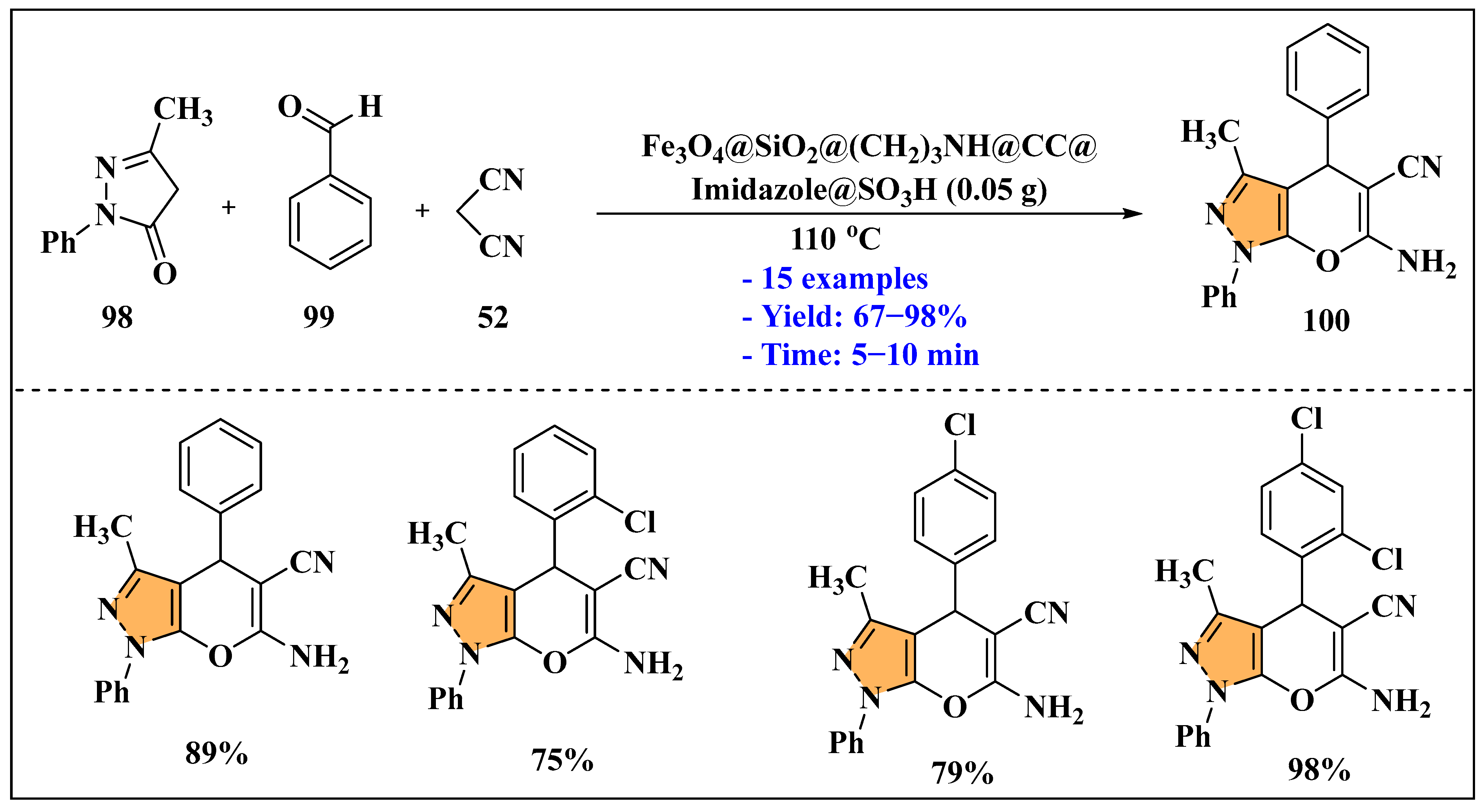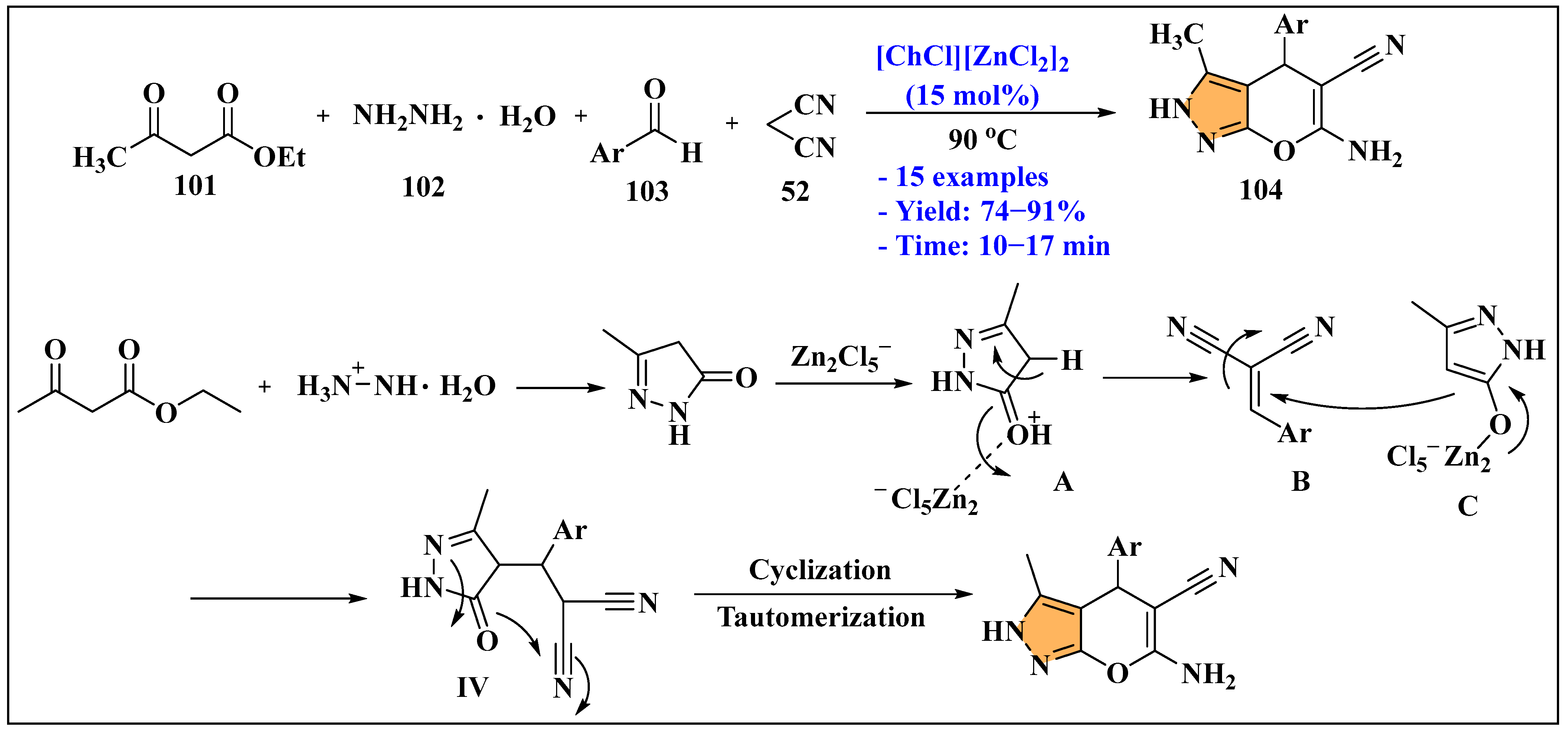 - Zakeri, M.; Nasef, M.M.; Kargaran, T.; Ahmad, A.; Abouzari-Lotf, E.; Asadi, J. Synthesis of pyrano[2,3-c]pyrazoles by ionic liquids under green and eco-safe conditions. Res. Chem. Intermed. 2017, 43, 717–728. [Google Scholar] [CrossRef]