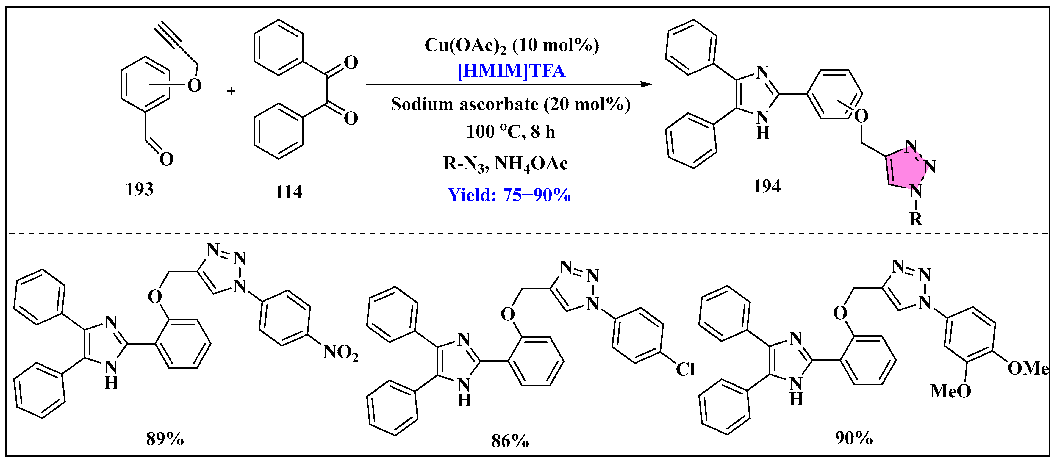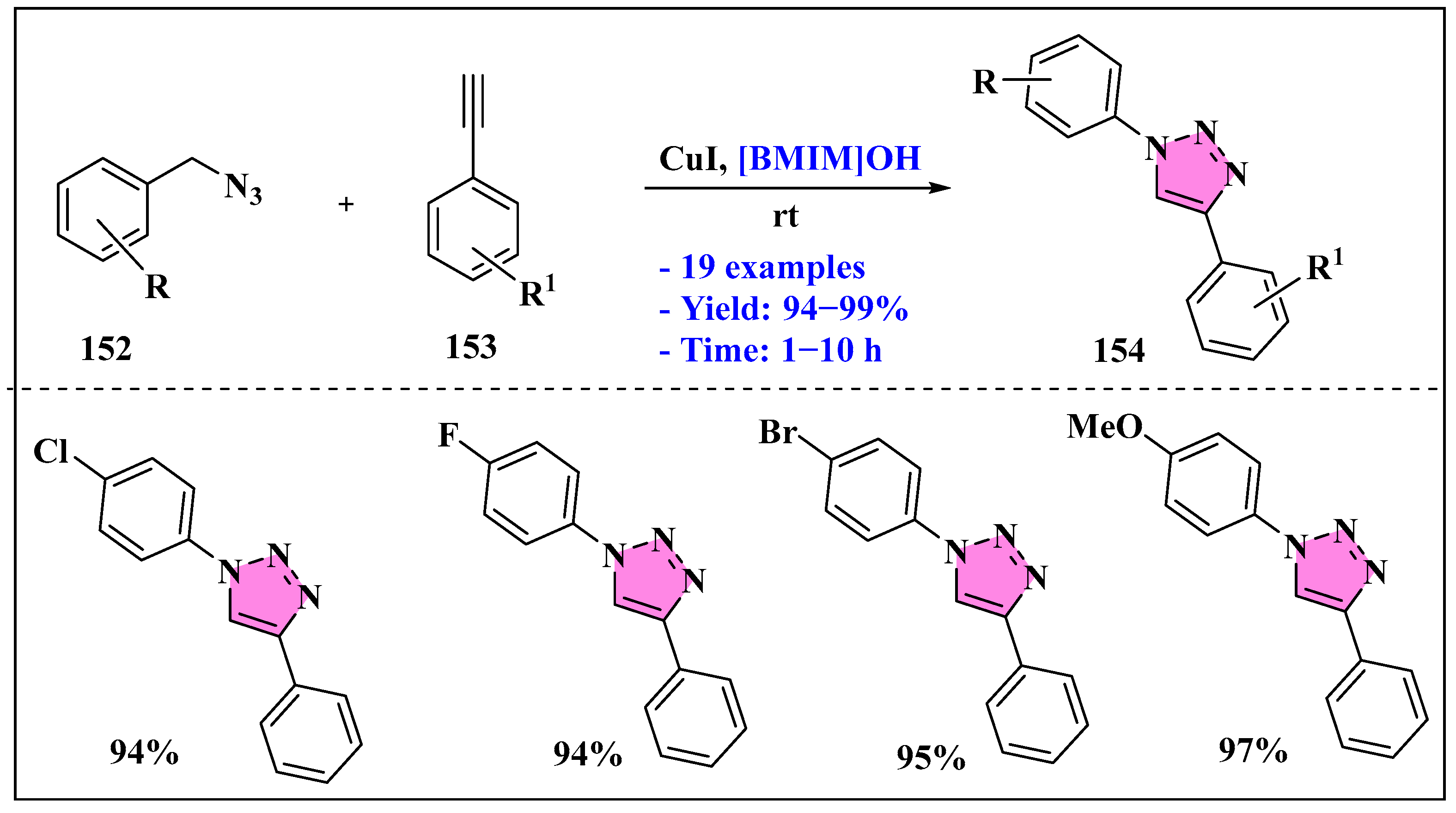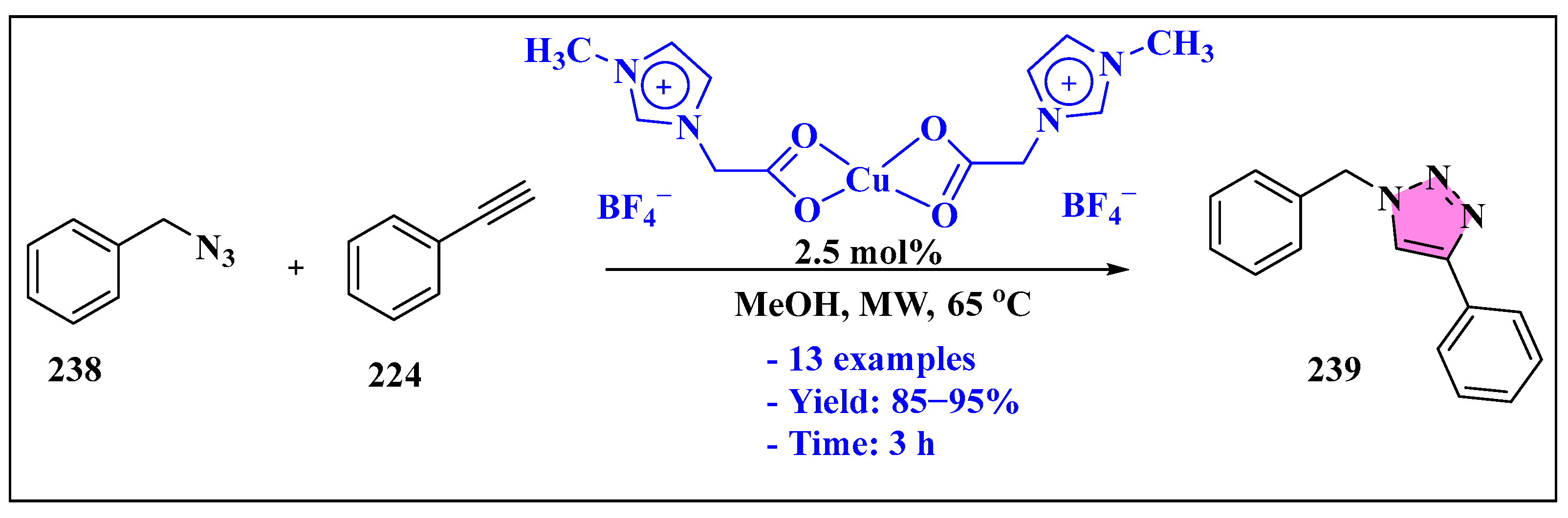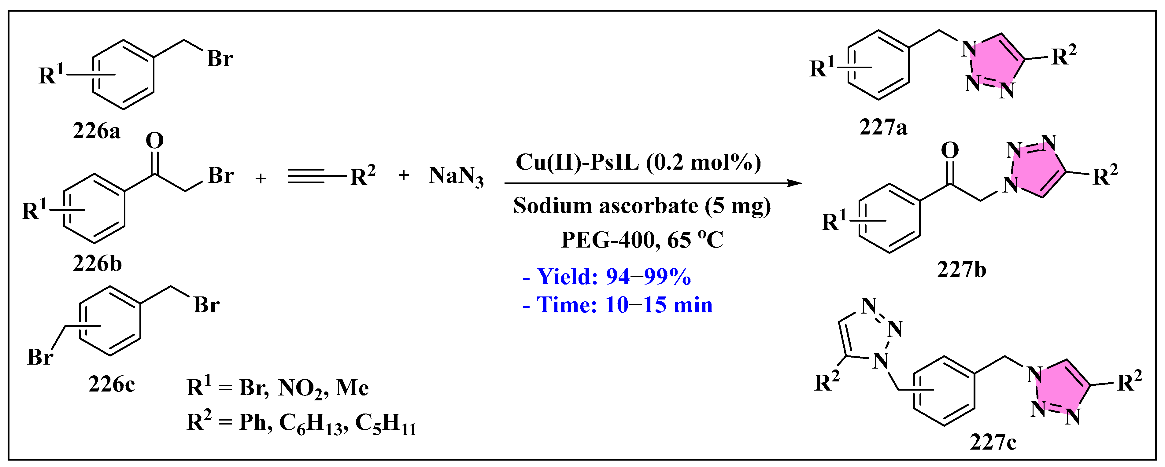 - Phukan, P.; Kulshrestha, A.; Kumar, A.; Chakraborti, S.; Chattopadhyay, P.; Sarma, D. Cu(II) ionic liquid promoted Simple and Economical Synthesis of 1,4-disubstituted-1,2,3-triazoles with Low Catalyst Loading. J. Chem. Sci. 2021, 133, 131. [Google Scholar] [CrossRef]