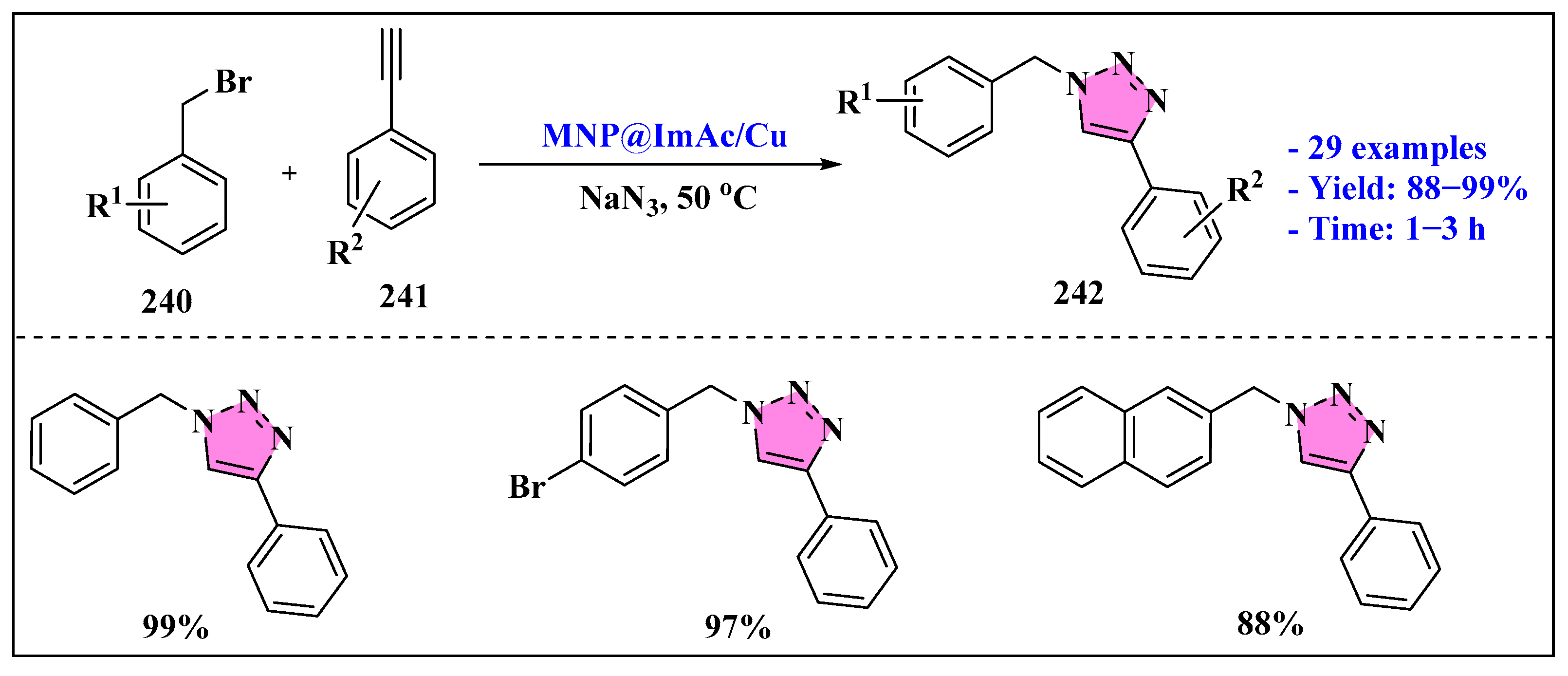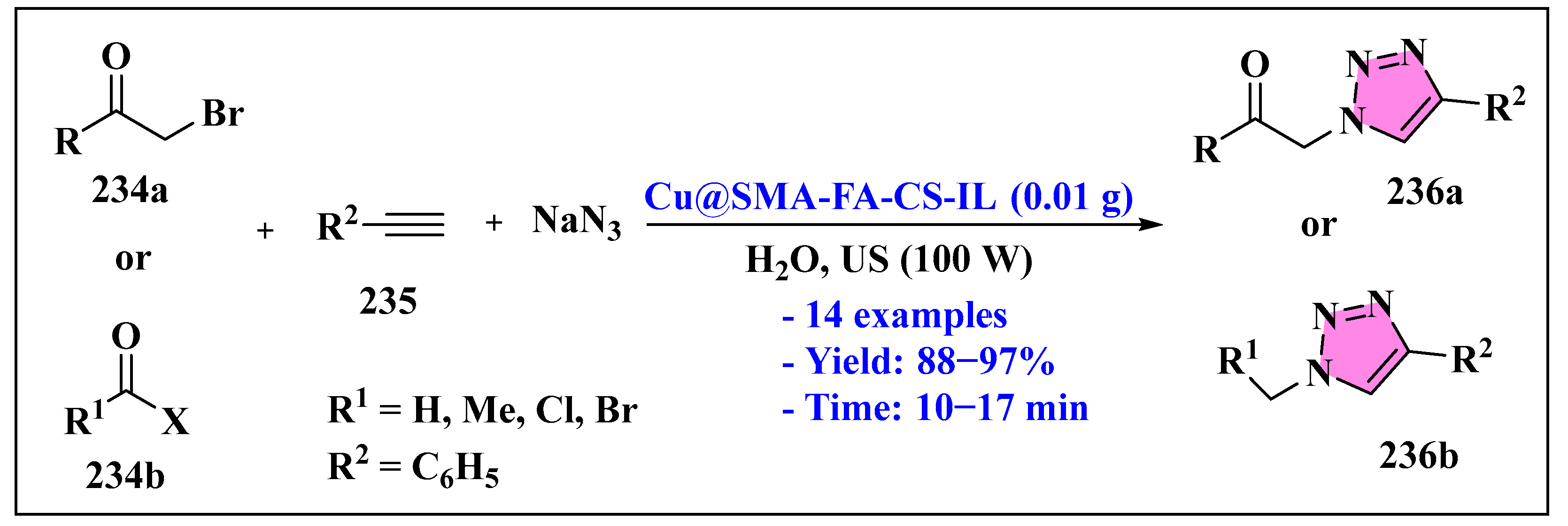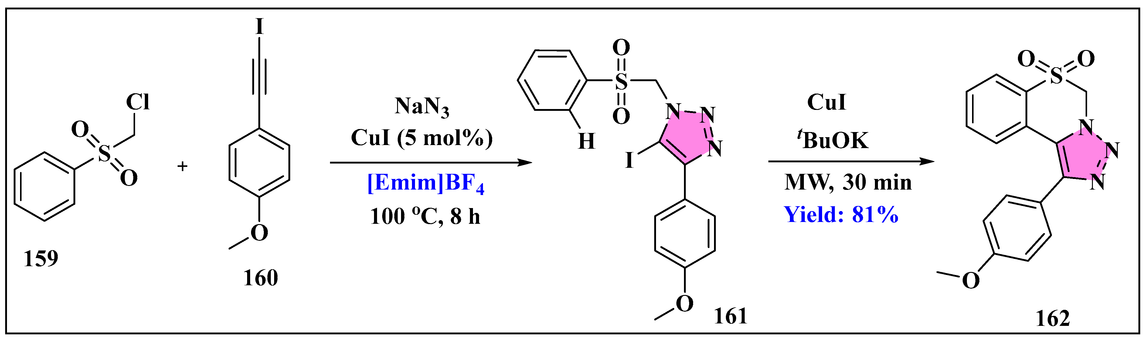 - Jaiswal, S.; Devi, M.; Sharma, N.; Rathi, K.; Dwivedi, J.; Sharma, S. Emerging approaches for synthesis of 1,2,3-triazole derivatives. A review. Org. Prep. Proced. Int. 2022, 54, 387–422. [Google Scholar] [CrossRef]