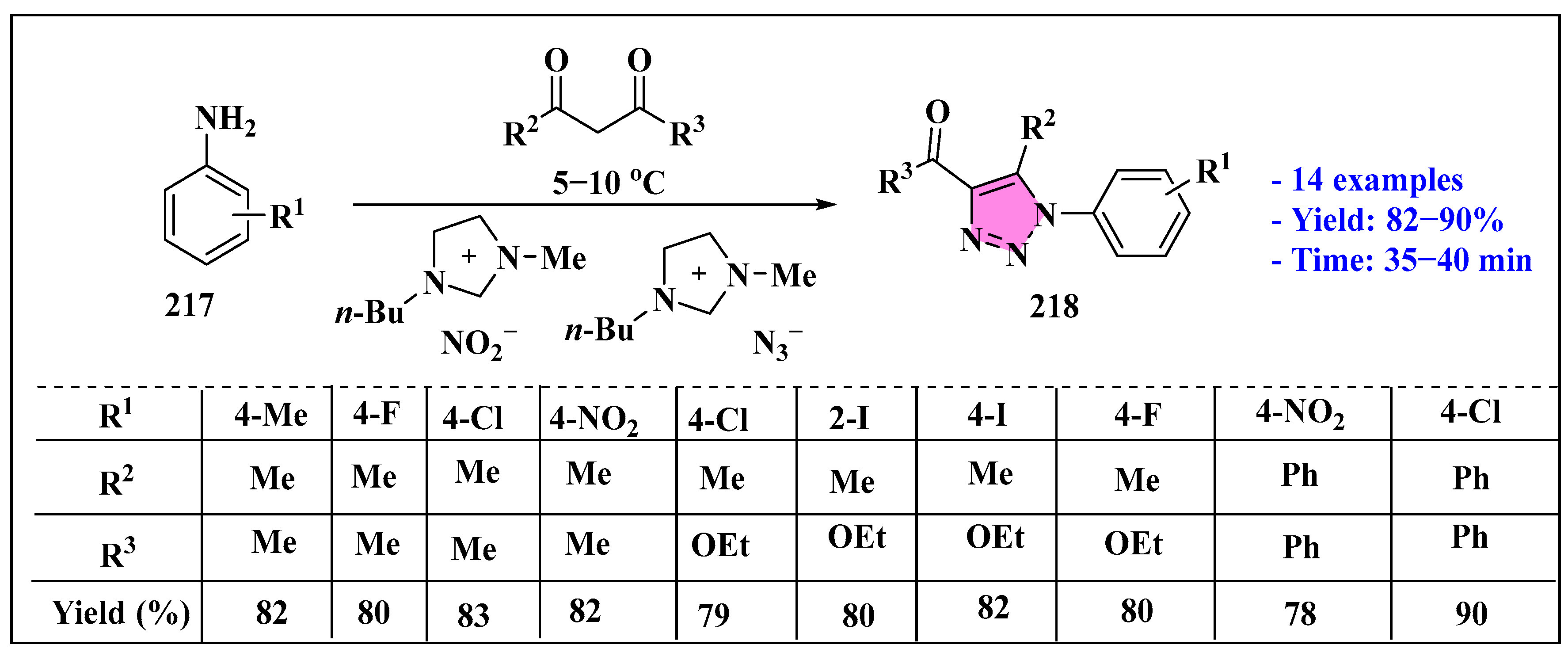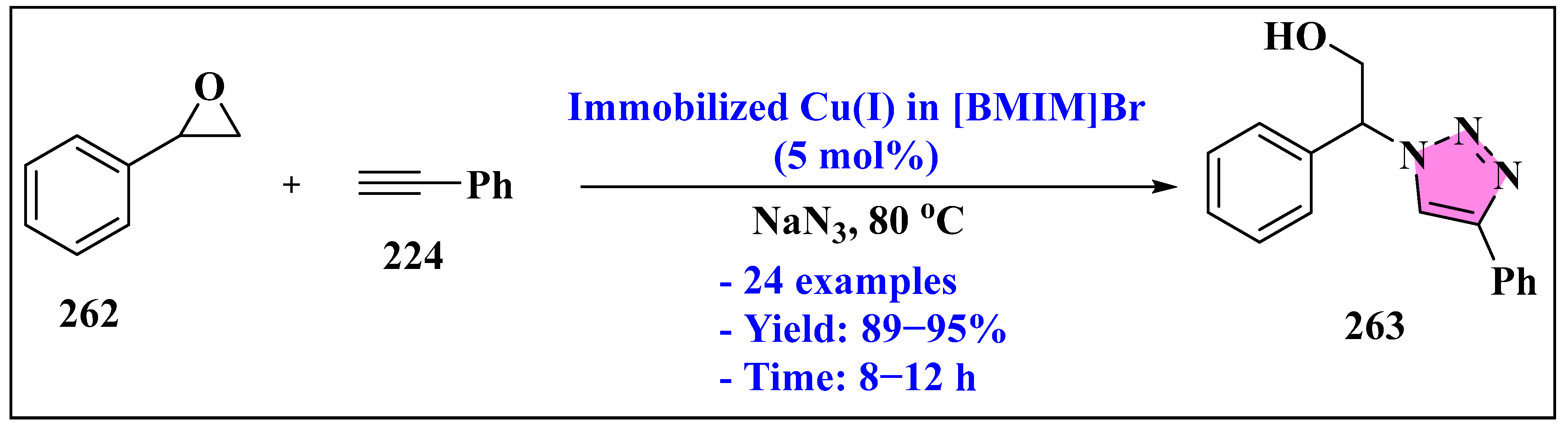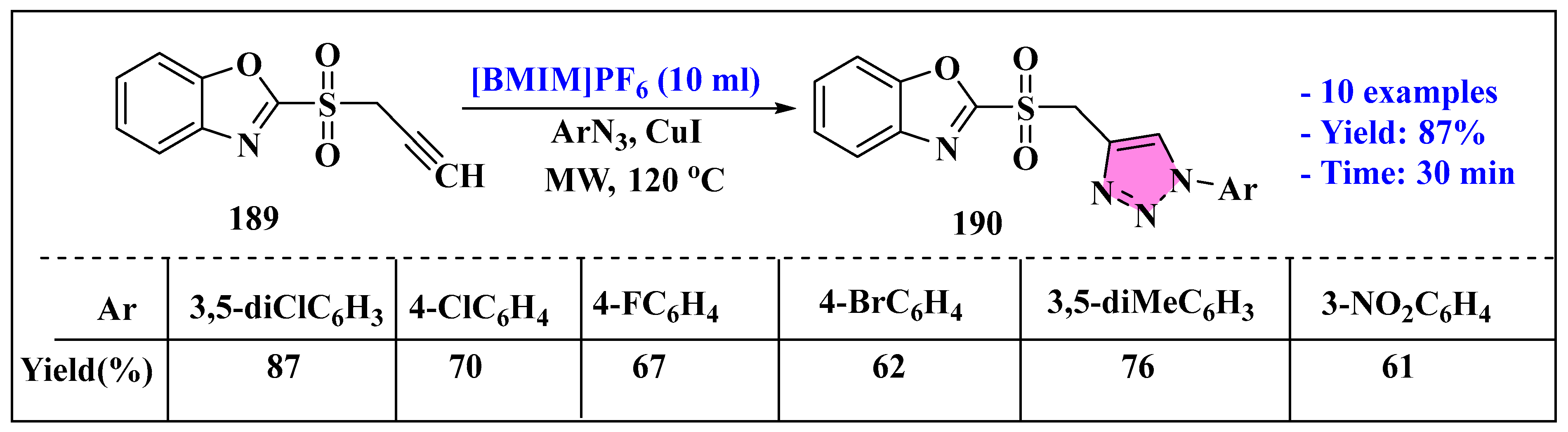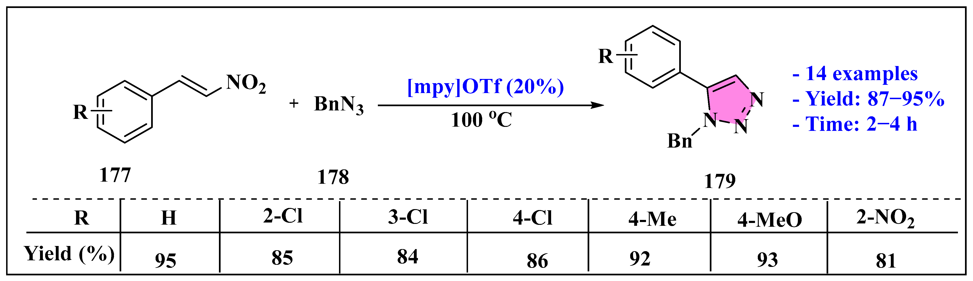 3.4.2. Ionic Liquids Mediated Miscellaneous Reaction for Triazole Synthesis in Homogeneous Phase