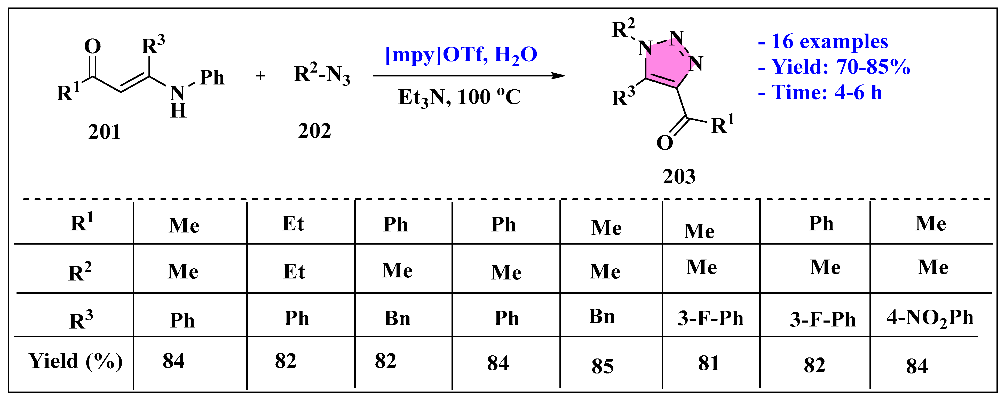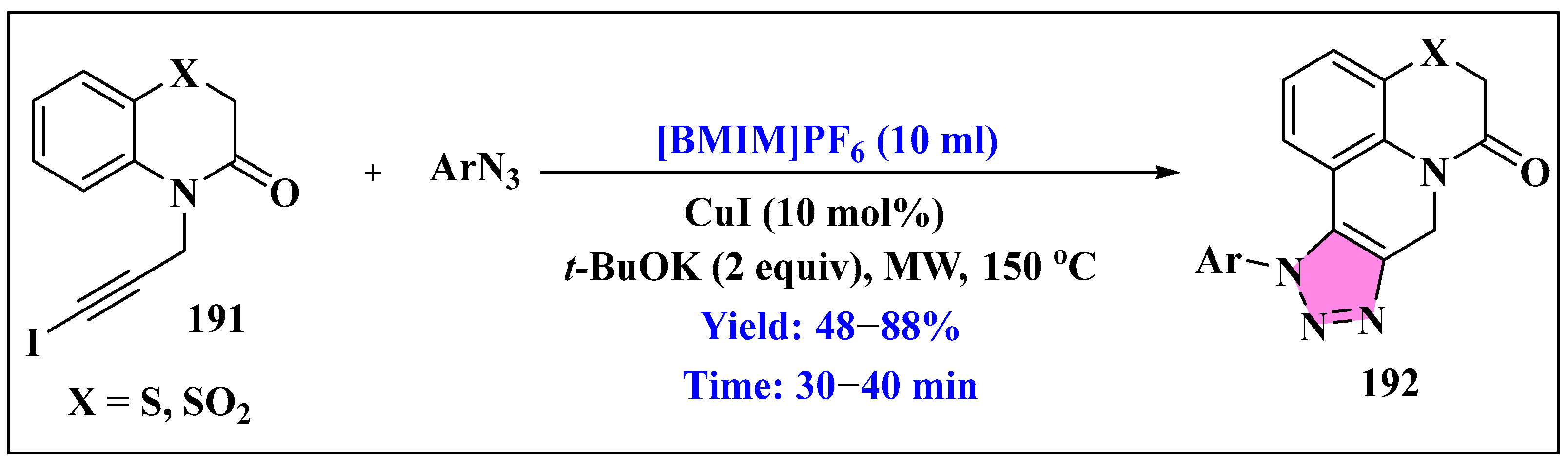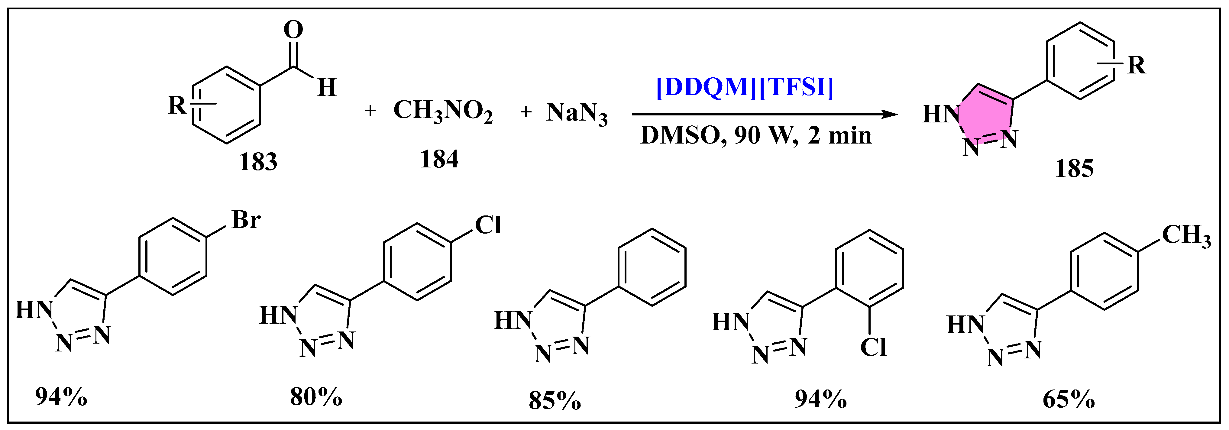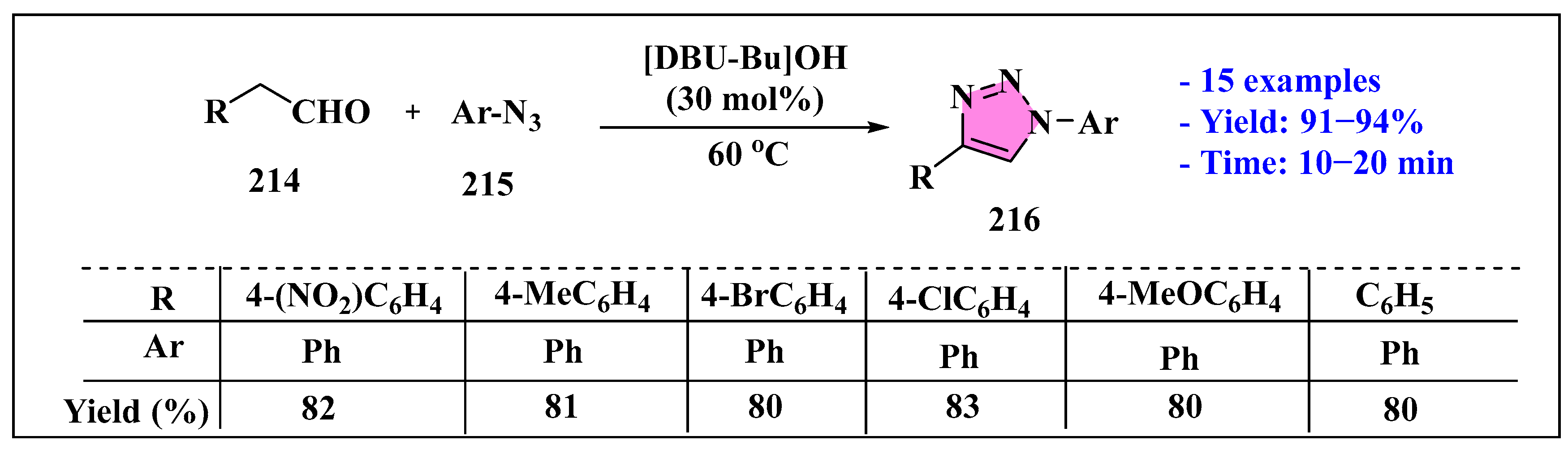 3.4.2. Ionic Liquids Mediated Miscellaneous Reaction for Triazole Synthesis in Homogeneous Phase