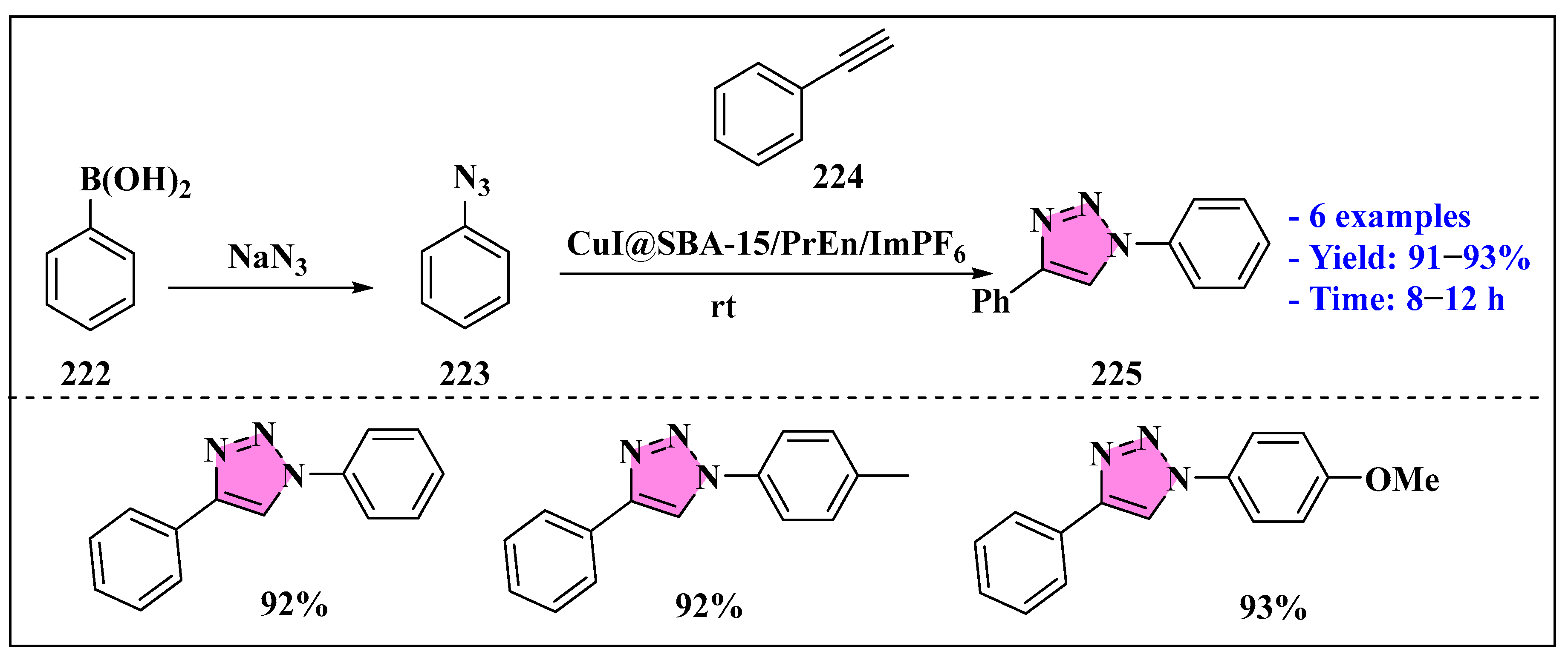 CuI@SBA-15/PrEn/ImPF6 | Mesoporous silica SBA-15 skeleton which bears a supported ethylenediamine/CuI complex and covalently anchored imidazolium/PF6 ionic liquid | [97] |