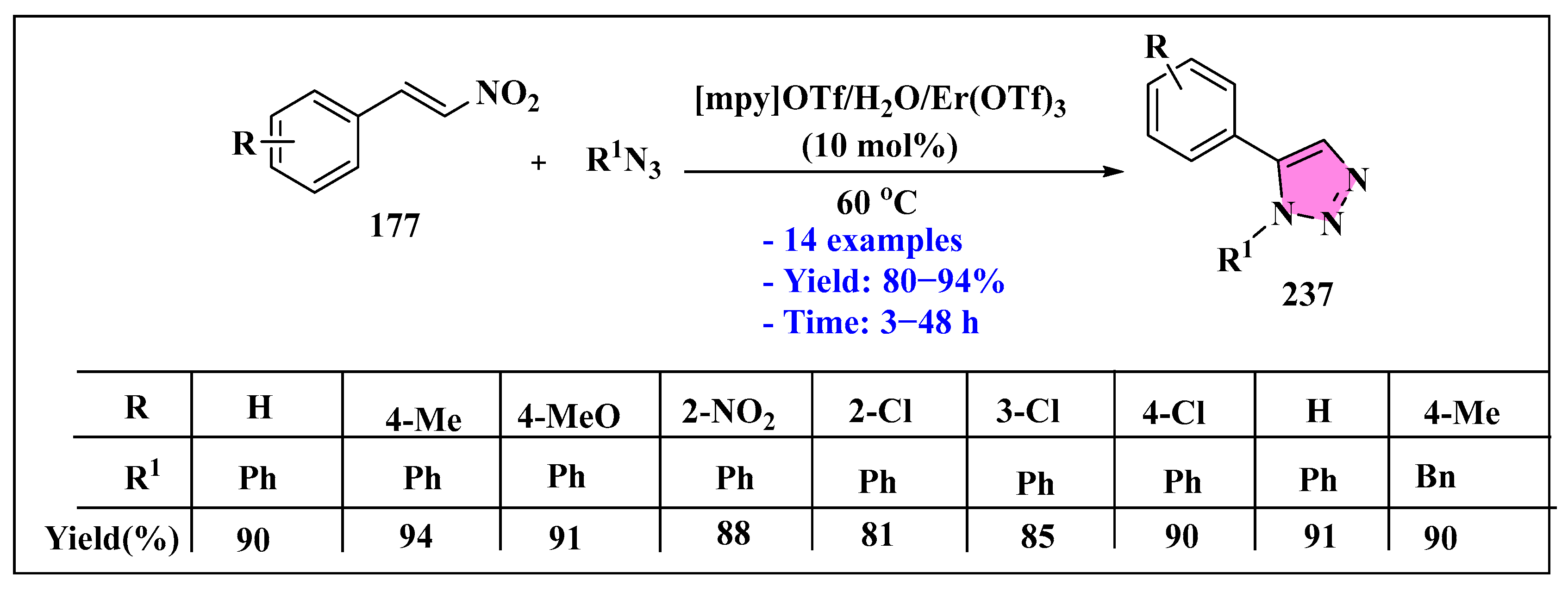 - Maiuolo, L.; Russo, B.; Algieri, V.; Nardi, M.; Di Gioia, M.L.; Tallarida, M.A.; De Nino, A. Regioselective synthesis of 1,5-disubstituted 1,2,3-triazoles by 1,3-dipolar cycloaddition: Role of Er(OTf)3, ionic liquid and water. Tetrahedron Lett. 2019, 60, 672–674. [Google Scholar] [CrossRef]