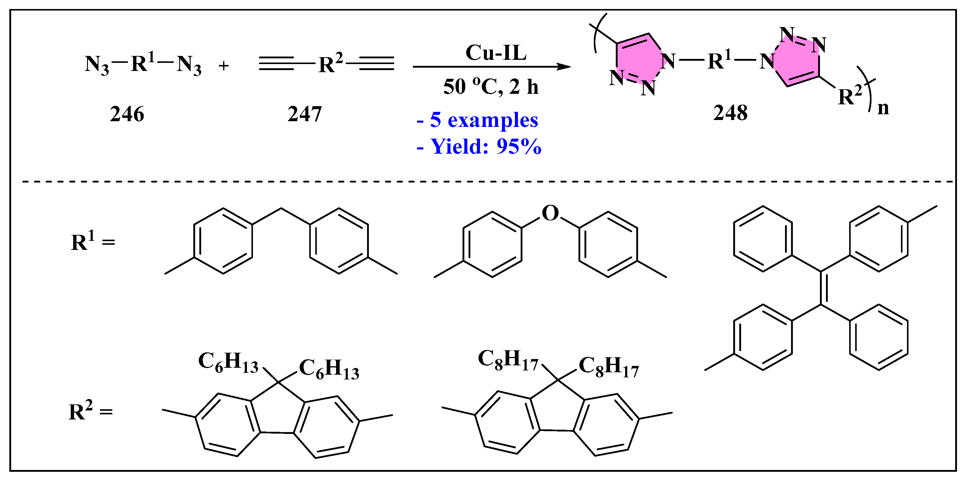 - Li, B.; Hu, R.; Qin, A.; Tang, B.Z. Copper-based ionic liquid-catalyzed click polymerization of diazides and diynes toward functional polytriazoles for sensing applications. Polym. Chem. 2020, 11, 2006–2014. [Google Scholar] [CrossRef]