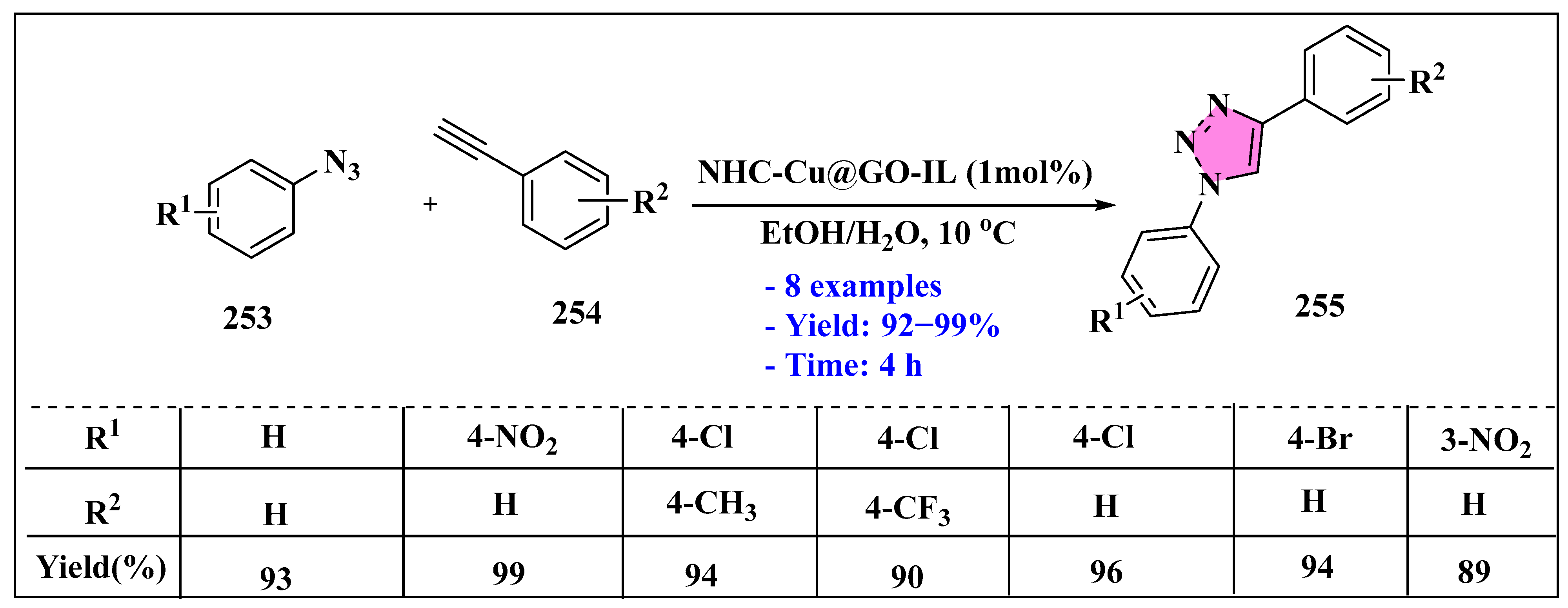 - Dabiri, M.; Alavioon, S.I.; Movahed, S.K. N-Heterocyclic carbene–copper complex supported on ionic liquid-modified graphene oxide: Versatile catalyst for synthesis of (i) 1,2,3-triazole and (ii) propargylamine derivatives. J. Iran. Chem. Soc. 2018, 15, 2463–2474. [Google Scholar] [CrossRef]