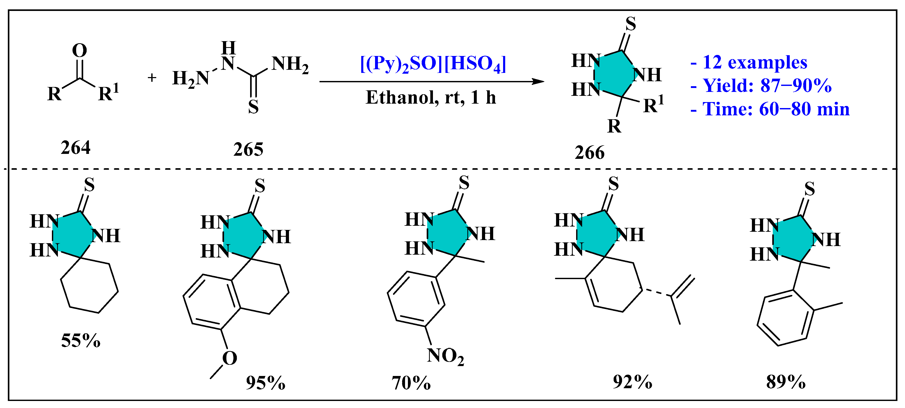 - Shinde, V.B.; Mhaldar, P.M.; Chhowala, T.N.; Mirzaei, M.; Ghotekar, S.K.; Rashinkar, G.S.; Pore, D.M. An efficient Brønsted acid ionic liquid catalyzed synthesis of novel spiro1,2,4-triazolidine-5-thiones and their photoluminescence study. J. Mol. Struct. 2022, 1249, 131528. [Google Scholar] [CrossRef]