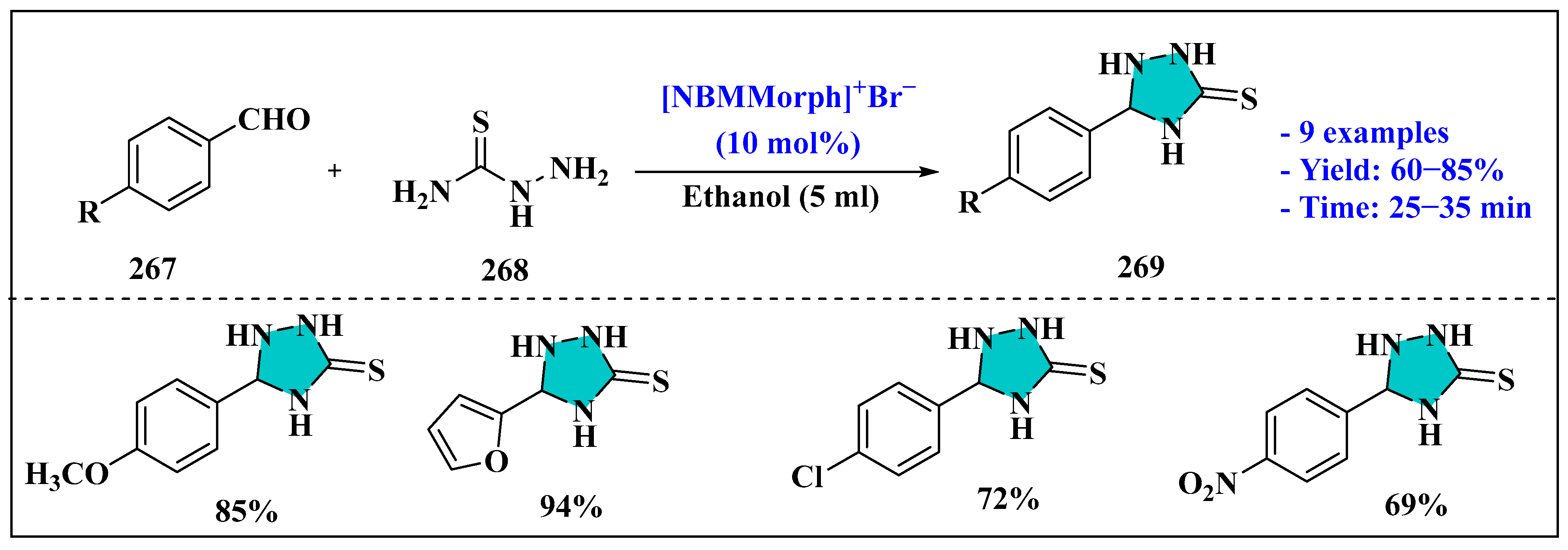 - Patil, P.B.; Patil, J.D.; Korade, S.N.; Kshirsagar, S.D.; Govindwar, S.P.; Pore, D.M. An efficient synthesis of anti-microbial 1,2,4-triazole-3-thiones promoted by acidic ionic liquid. Res. Chem. Intermed. 2016, 42, 4171–4180. [Google Scholar] [CrossRef]
