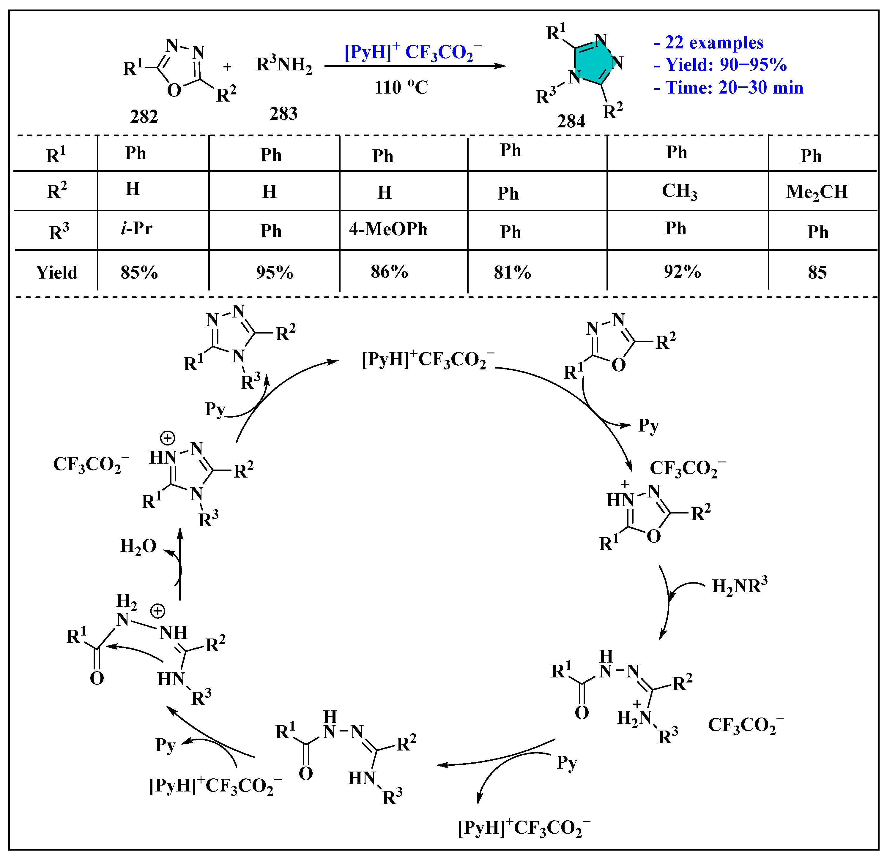 - Chen, X.; Liu, R.; Xu, Y.; Zou, G. Tunable protic ionic liquids as solvent-catalysts for improved synthesis of multiply substituted 1,2,4-triazoles from oxadiazoles and organoamines. Tetrahedron 2012, 68, 4813–4819. [Google Scholar] [CrossRef]