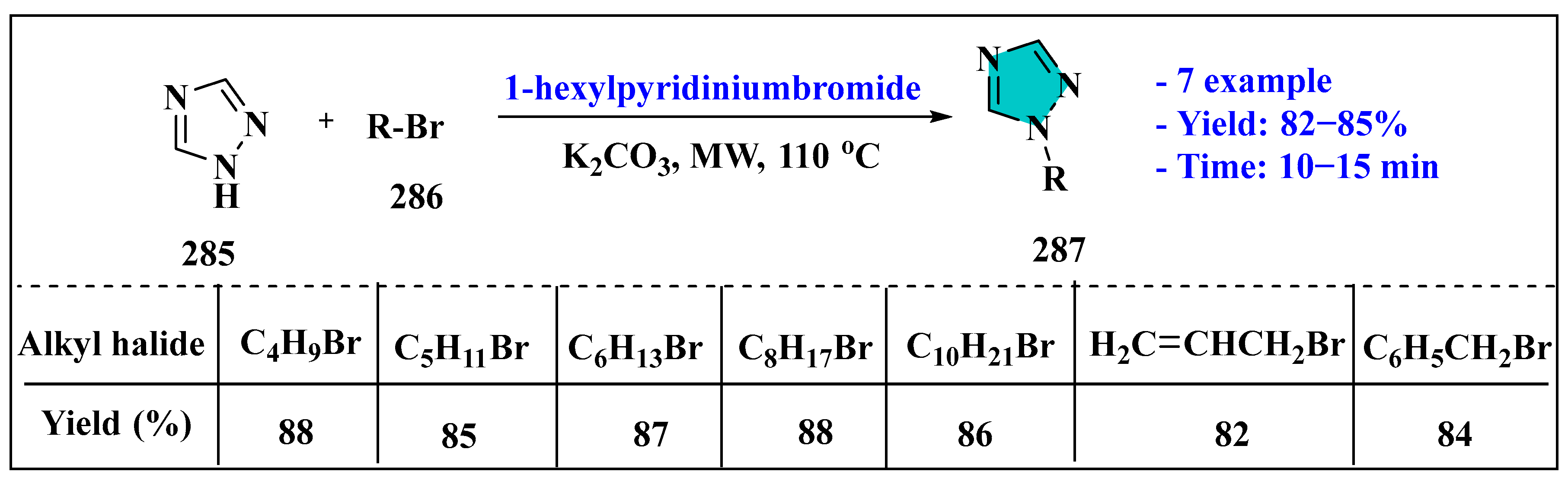 - Kaur, R.; Kumar, B.; Dwivedi, A.R.; Kumar, V. Regioselective alkylation of 1, 2, 4-triazole using ionic liquids under microwave conditions. Green Process. Synth. 2016, 5, 233–237. [Google Scholar] [CrossRef]