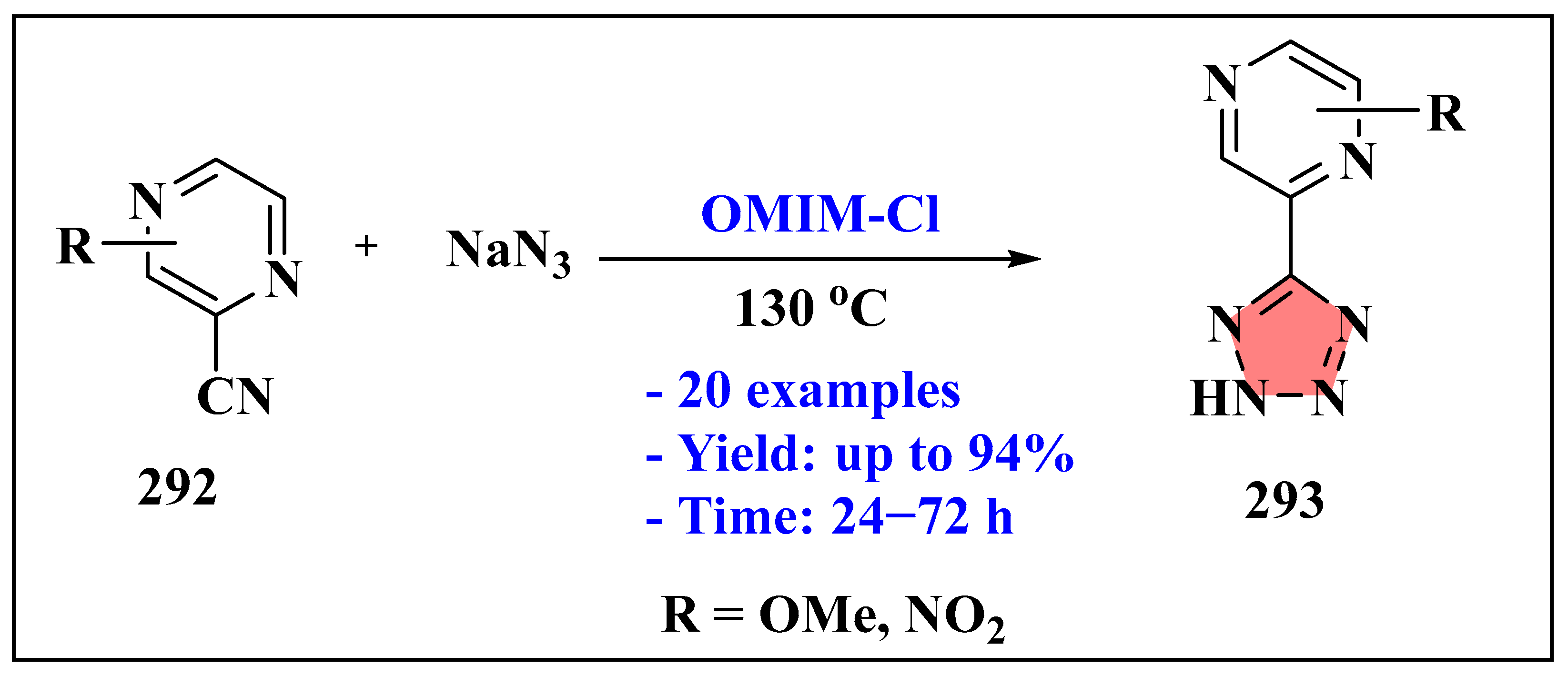 - Khaghaninejad, S.; Heravi, M.M.; Hosseinnejad, T.; Oskooie, H.A.; Bakavoli, M. Regio-selective synthesis of 5-substituted 1H-tetrazoles using ionic liquid [BMIM]N3 in solvent-free conditions: A click reaction. Res. Chem. Intermed. 2016, 42, 1593–1610. [Google Scholar] [CrossRef]