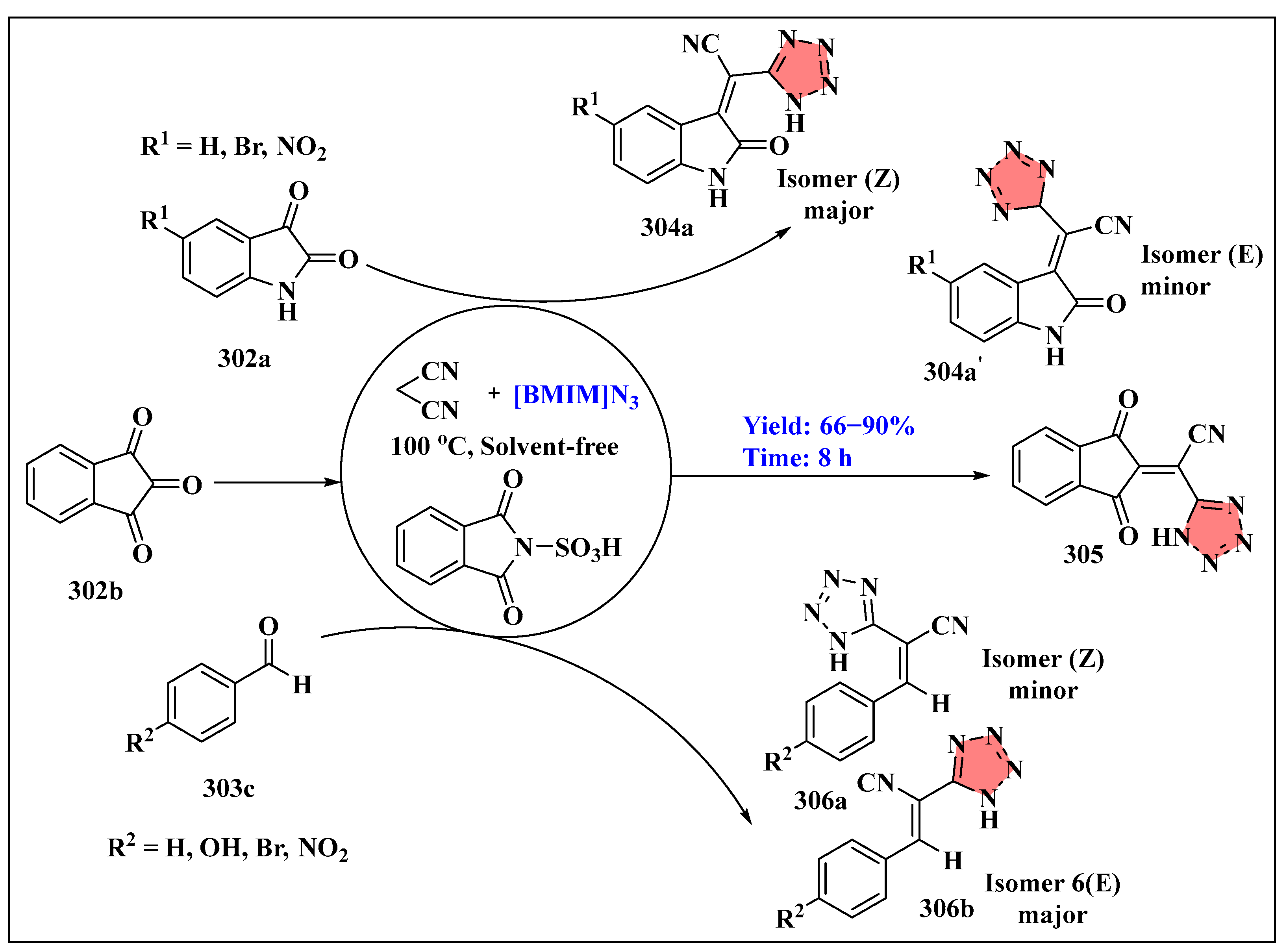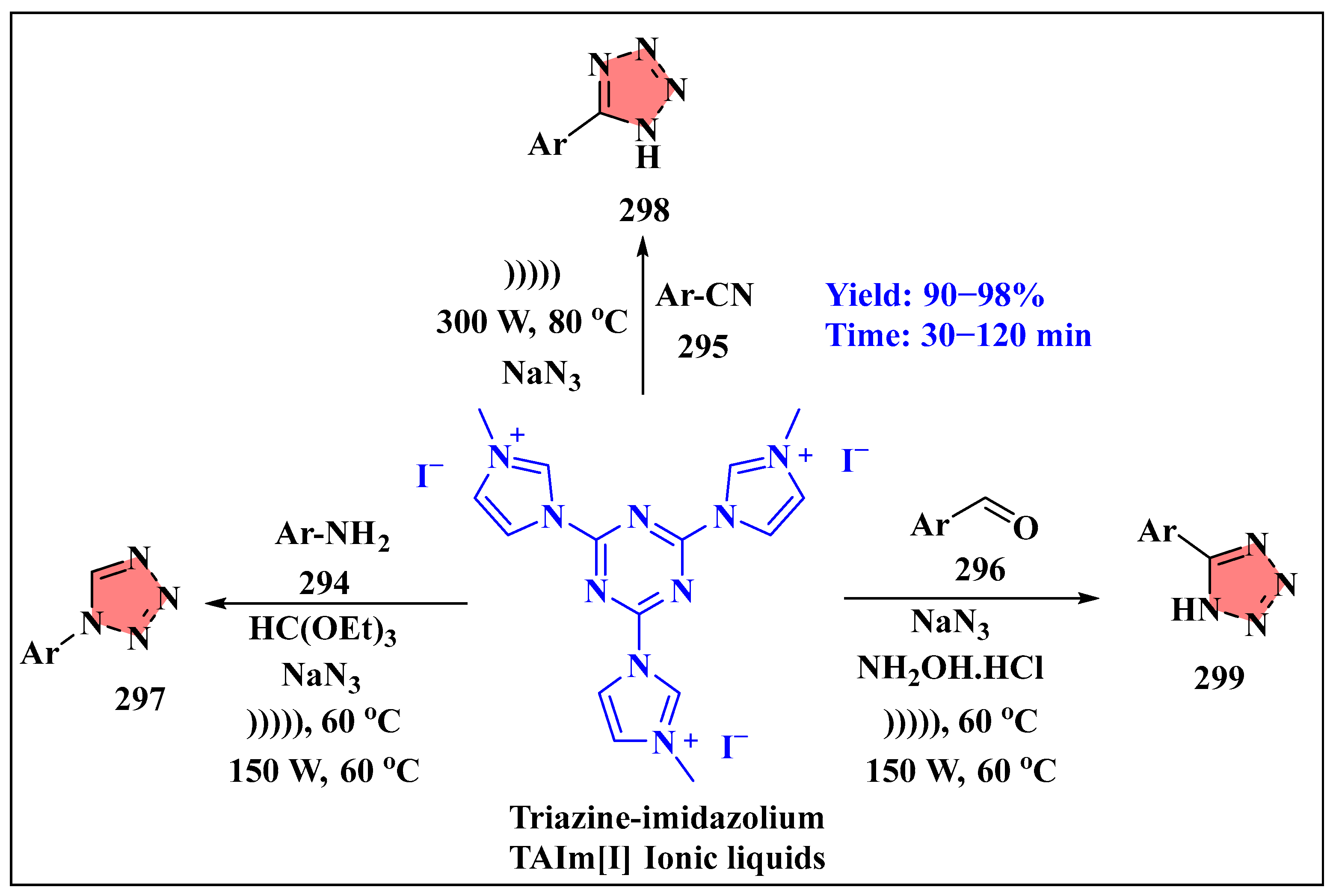 - Jasim, S.A.; Tanjung, F.A.; Sharma, S.; Mahmoud, M.Z.; Kadhim, S.B.; Kazemnejadi, M. Ultrasound and microwave irradiated sustainable synthesis of 5-and 1-substituted tetrazoles in TAIm[I] ionic liquid. Res. Chem. Intermed. 2022, 48, 3547–3566. [Google Scholar] [CrossRef]