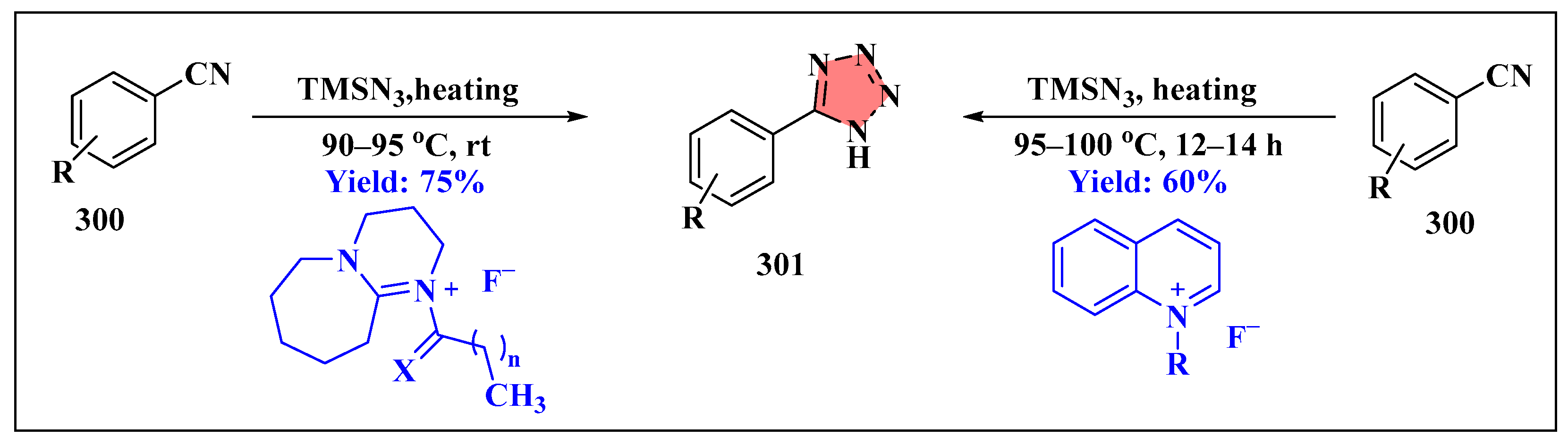 - Iqbal, N.; Hashim, J.; Ali, S.A.; Al-Rashida, M.; Alharthy, R.D.; Ahmad, S.; Khan, K.M.; Basha, F.Z.; Moin, S.T.; Hameed, A. Solvent-free 1H-tetrazole,1,2,5,6-tetrahydronicotinonitrile and pyrazole synthesis using quinoline based ionic fluoride salts (QuFs): Thermal and theoretical studies. RSC Adv. 2015, 5, 95061–95072. [Google Scholar] [CrossRef]