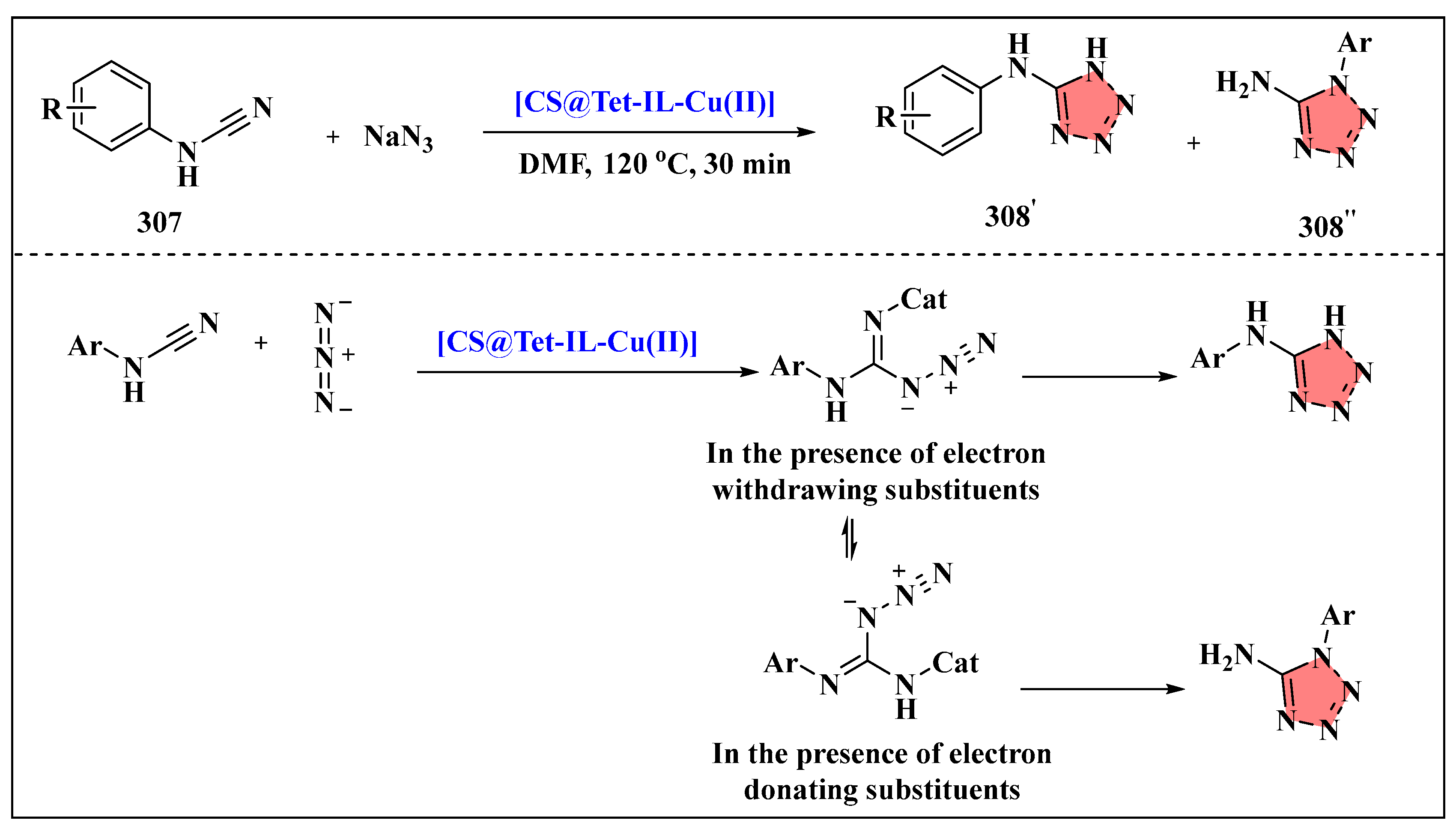 - Nasrollahzadeh, M.; Motahharifar, N.; Nezafat, Z.; Shokouhimehr, M. Chitosan supported 1-phenyl-1H-tetrazole-5-thiol ionic liquid copper(II) complex as an efficient catalyst for the synthesis of arylaminotetrazoles. J. Mol. Liq. 2021, 341, 117398. [Google Scholar] [CrossRef]