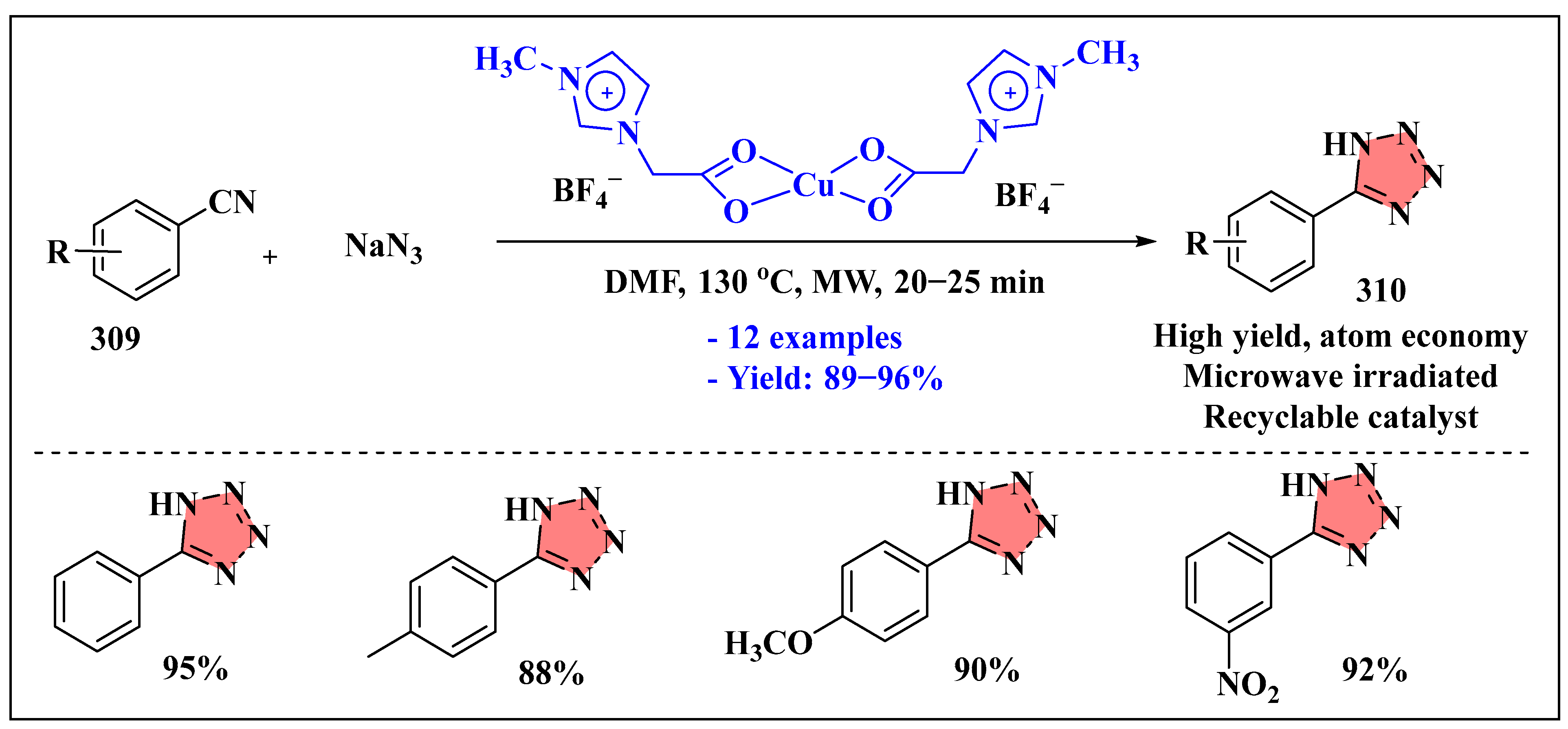 - Padmaja, R.D.; Chanda, K. A robust and recyclable ionic liquid-supported copper(II) catalyst for the synthesis of 5-substituted-1H-tetrazoles using microwave irradiation. Res. Chem. Intermed. 2020, 46, 1307–1317. [Google Scholar] [CrossRef]