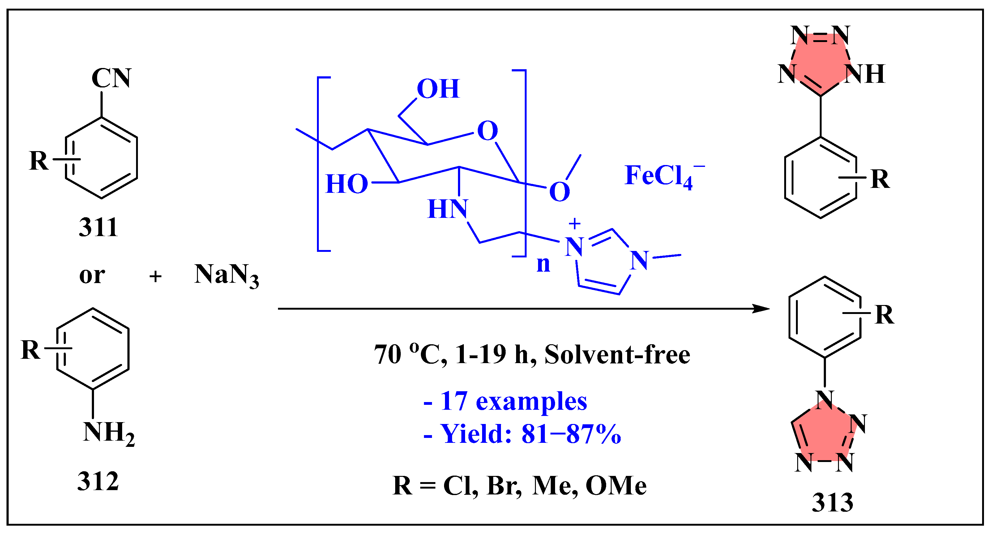 - Khalafi-Nezhad, A.; Mohammadi, S. Highly efficient synthesis of 1-and 5-substituted 1H-tetrazoles using chitosan derived magnetic ionic liquid as a recyclable biopolymer-supported catalyst. RSC Adv. 2013, 3, 4362–4371. [Google Scholar] [CrossRef]
