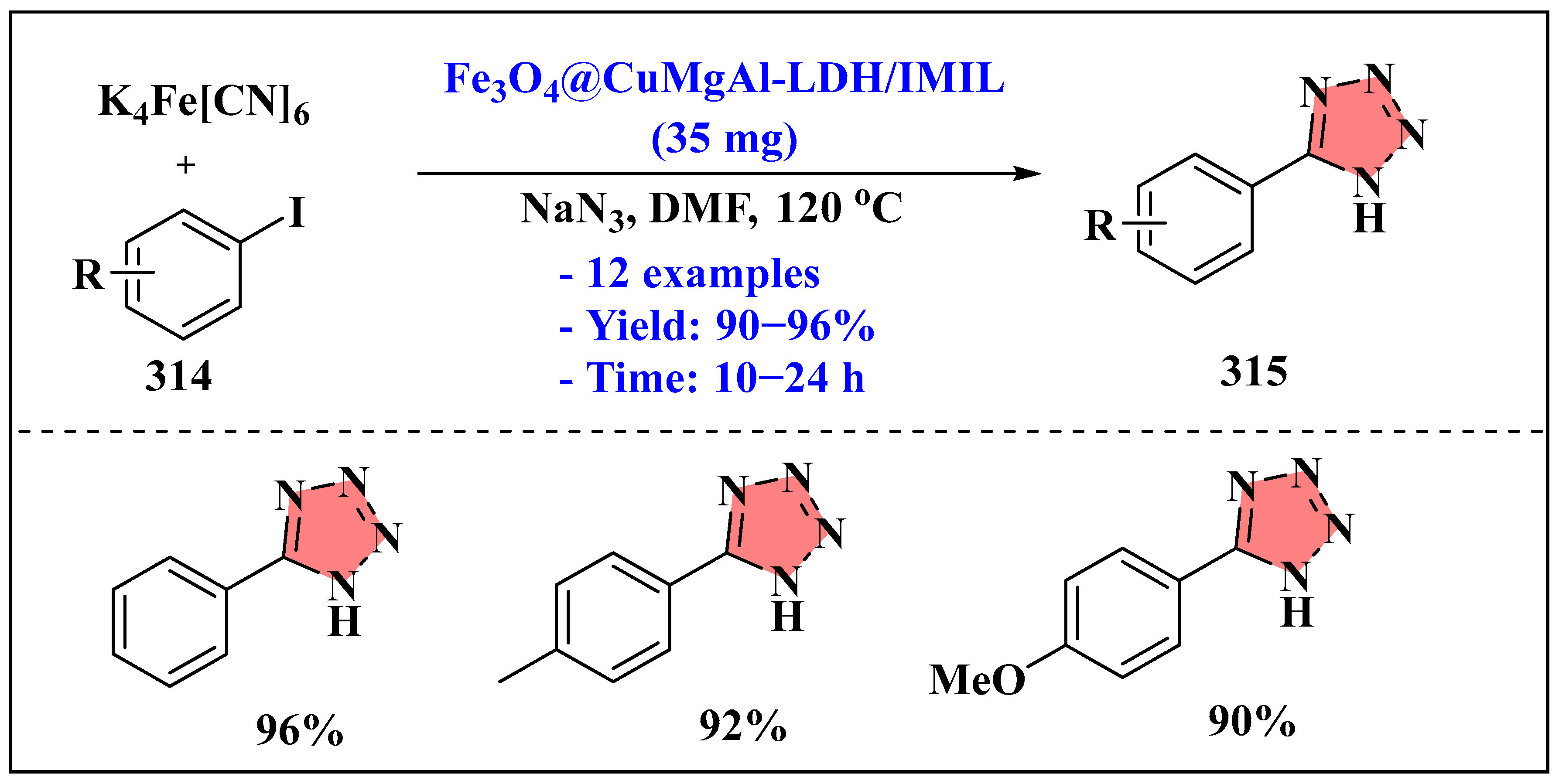 - Leilan, A.H.; Babazadeh, M.; Hekmati, M.; Ghasemi, E. Application of modified copper-doped Fe3O4@ CuMgAl-LDH nanoreactor with imidazolium ionic liquid as a reusable catalyst for synthesis of tetrazoles from aryl halides. Inorg. Chem. Commun. 2023, 155, 111044. [Google Scholar] [CrossRef]