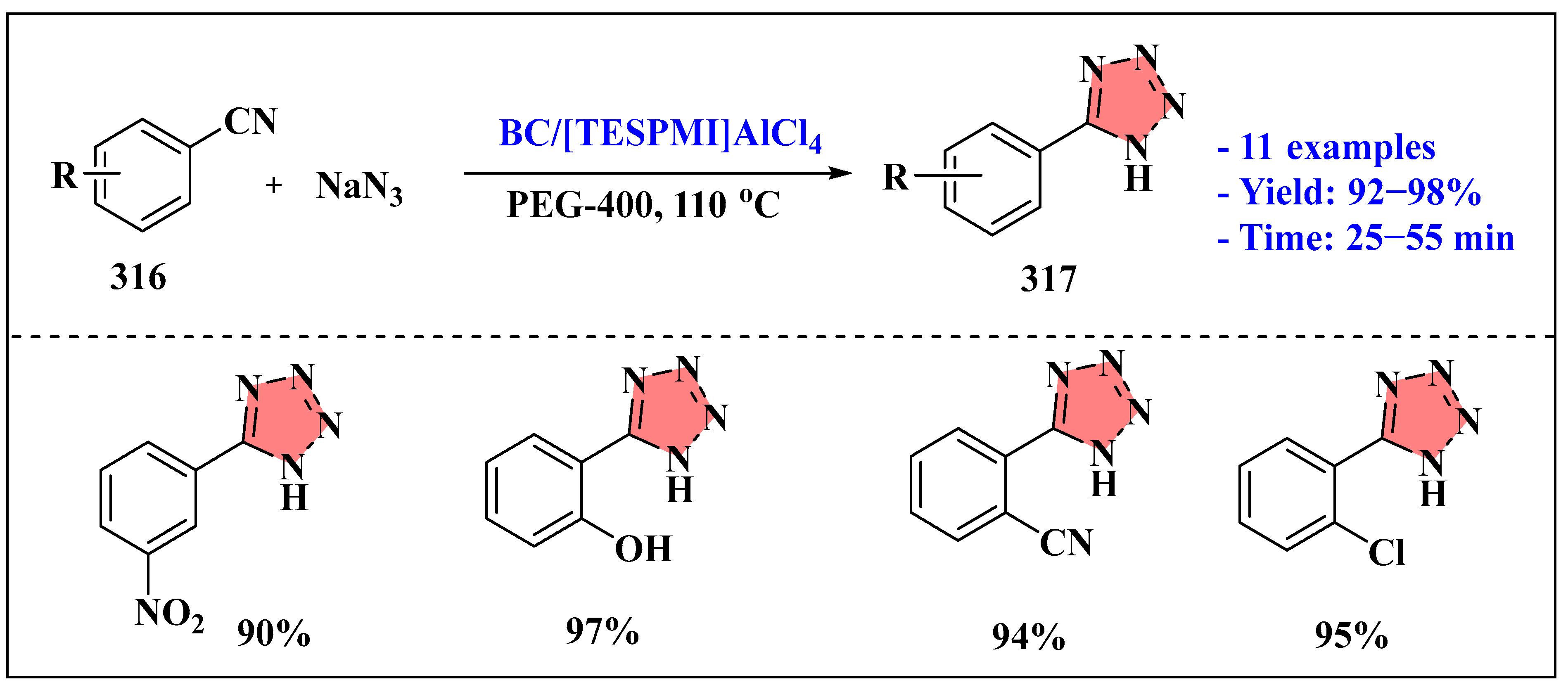 - Norouzi, M.; Moradi, P.; Khanmoradi, M. Aluminium-based ionic liquid grafted on biochar as a heterogeneous catalyst for the selective synthesis of tetrazole and 2,3-dihydroquinazolin 4(1H)-one derivatives. RSC Adv. 2023, 13, 35569–35582. [Google Scholar] [CrossRef]