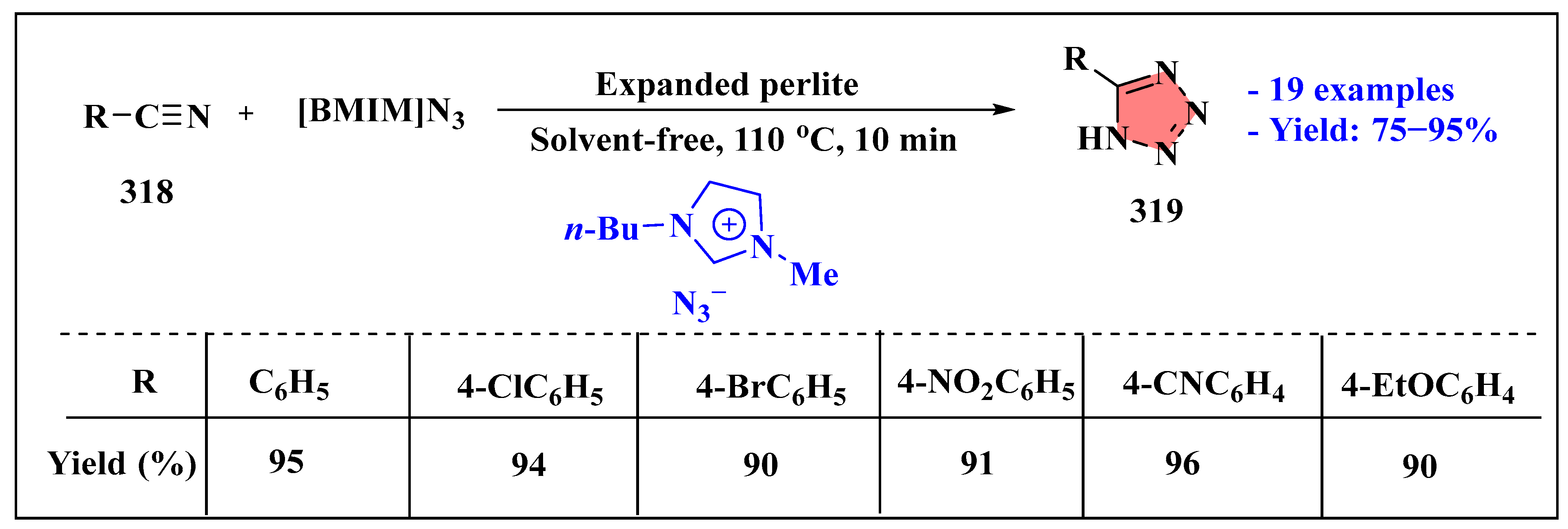 - Jahanshahi, R.; Akhlaghinia, B. Expanded perlite: An inexpensive natural efficient heterogeneous catalyst for the green and highly accelerated solvent-free synthesis of 5-substituted-1H-tetrazoles using [bmim]N3 and nitriles. RSC Adv. 2025, 5, 104087–104094. [Google Scholar] [CrossRef]