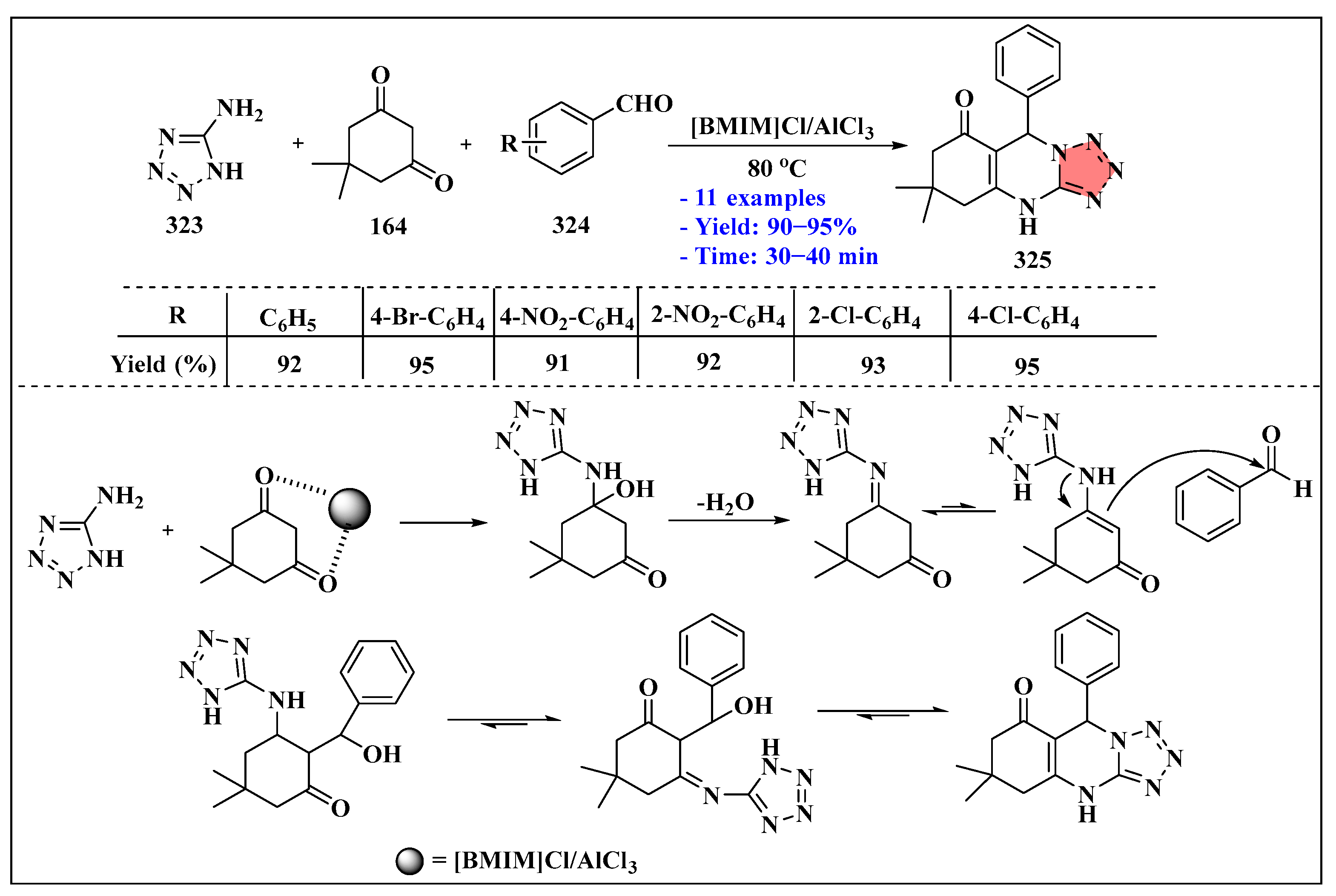 - Hassankhani, A.; Mosaddegh, E. One-pot, Environmentally Benign Procedure for the Synthesis of tetrahydrotetrazolo [1,5-a] quinazolines Using [Bmim]Cl/AlCl3 as a Task-specific Ionic Liquid. J. Appl. Chem. Res. 2019, 13, 89–96. [Google Scholar]