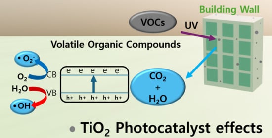 - Hanif, M.A.; Shin, H.; Chun, D.; Kim, H.G.; Kwac, L.K.; Kim, Y.S. Photocatalytic VOCs Degradation Efficiency of Polypropylene Membranes by Incorporation of TiO2 Nanoparticles. Membranes 2023, 13, 50. [Google Scholar] [CrossRef]