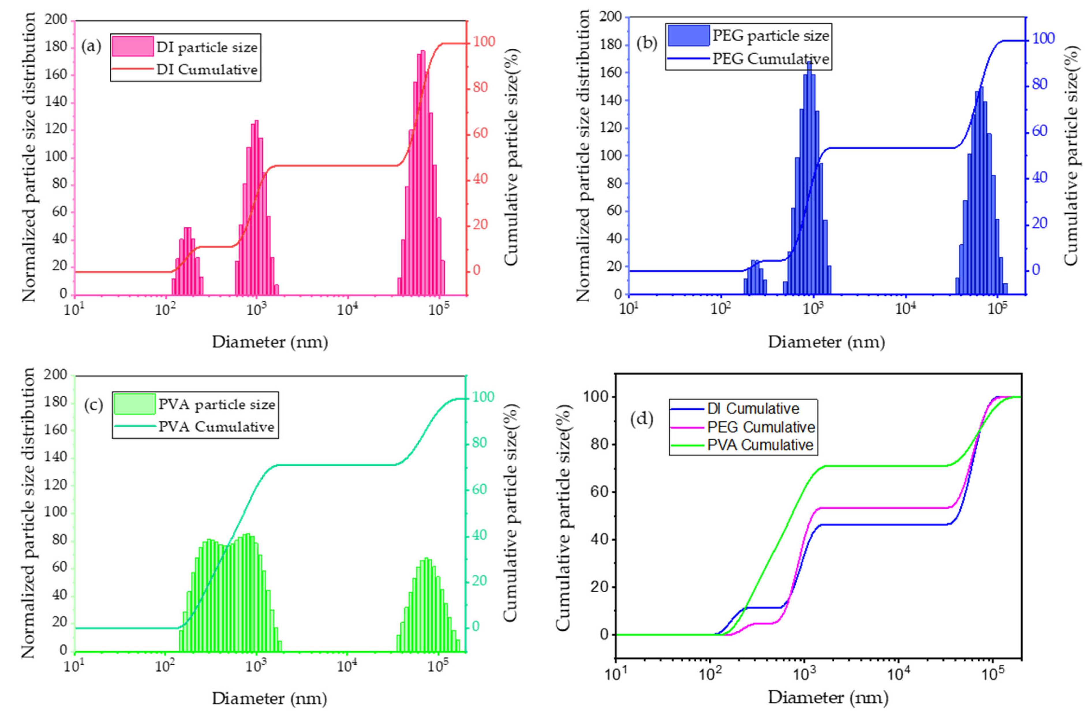 2.2.1. Particle Size Ratio Analysis by Distribution Range with PVA, PEG, and PEGME