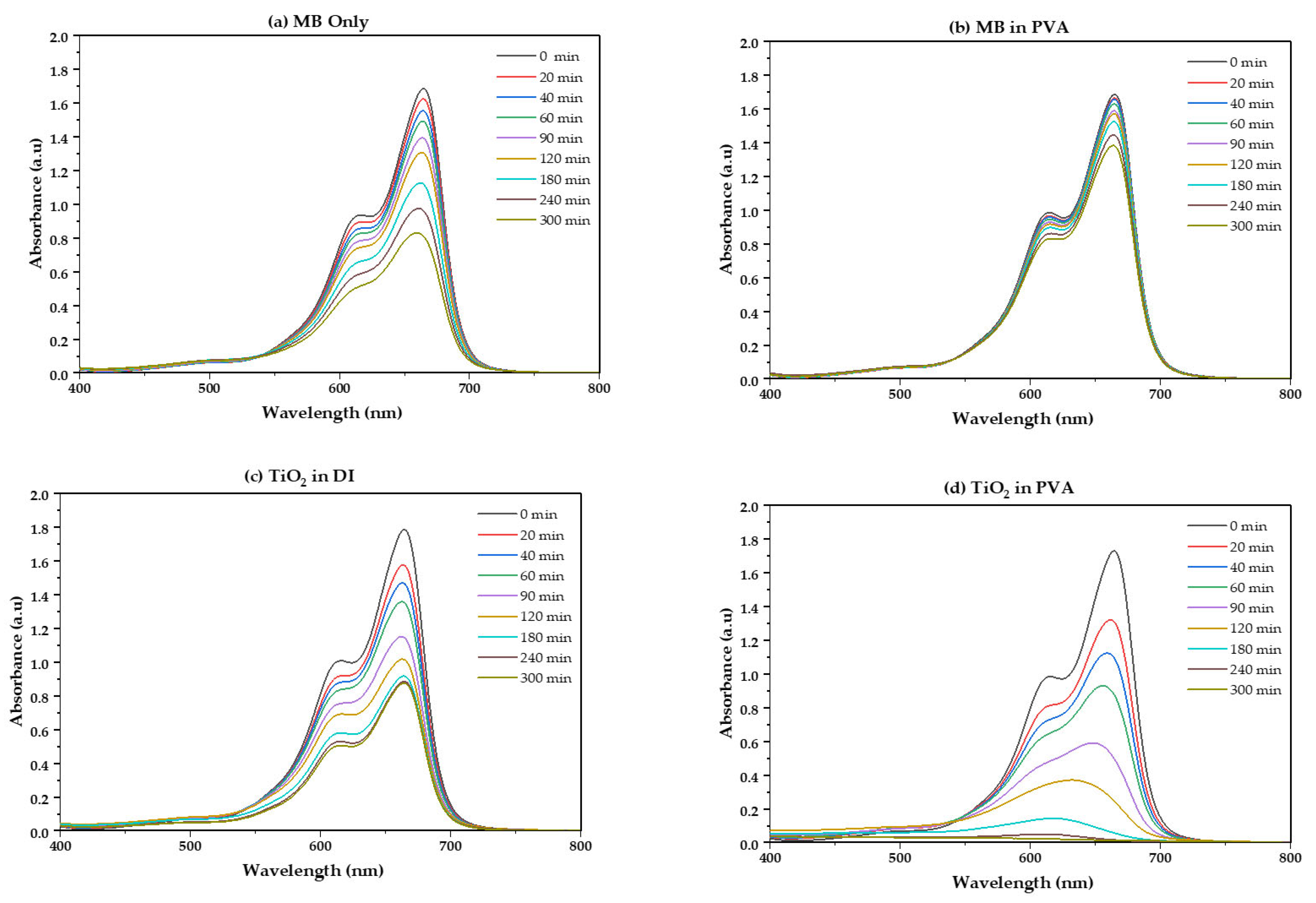 - When compared to TiO2 dispersed in DI, TiO2 dispersed in PVA showed better MB photodegradation ability.