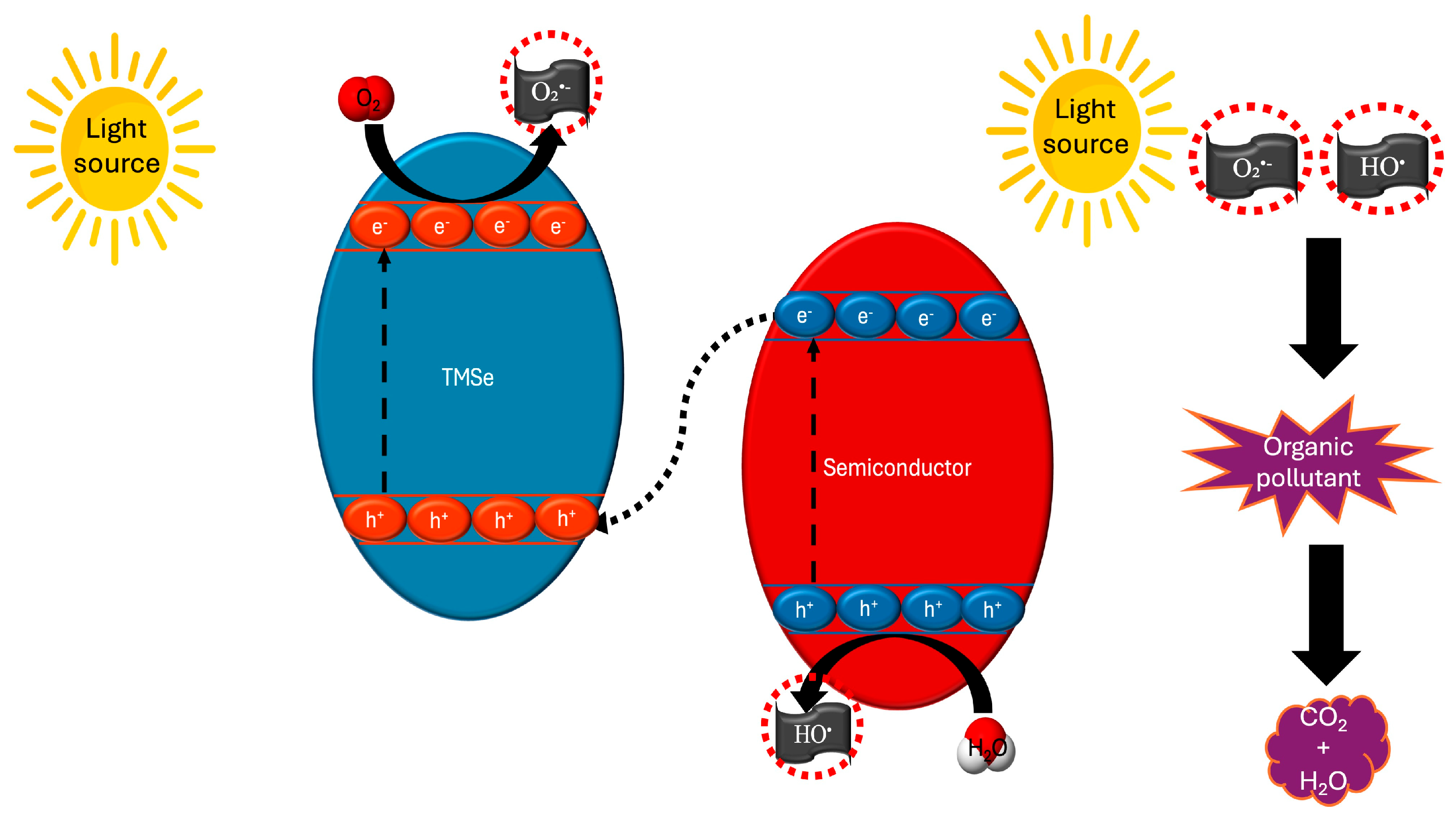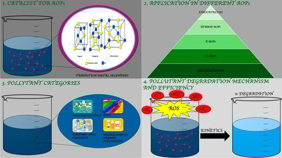 Taking into consideration all the properties of TMSes mentioned above, such as unique electronic structure, tunable band gap, and high catalytic activity, it is evident that TMSes can also be used in decontamination technologies for the degradation of organic pollutants, mainly in aqueous substrates. Previous reviews of TMSes have primarily focused on energy-related applications such as electrocatalysis for HER and OER (oxygen evolution reaction) [74,114,115,116,117,118,119], supercapacitors [120,121,122,123,124], solar cells [125], and rechargeable batteries [126,127,128,129]. While these reviews have comprehensively analyzed the electronic structures, synthetic strategies, and energy-related functionalities of these materials, only limited attention has been given to their role in environmental catalysis, which is restricted to photocatalytic degradation [69], and the discussion regarding TMSe-based composite catalysts has been fragmented. To date, no systematic review regarding TMSe-based catalysts for pollutant removal through AOPs has been presented. Therefore, this work aims to fill this gap and provide a comprehensive analysis of the use of TMSEs and their composites in AOPs, shedding light on the synthetic methods used to fabricate the catalysts with the desired characteristics, and analyzing the mechanisms that contribute to the degradation efficiency, as well as their stability and imminent use for large-scale environmental applications.
