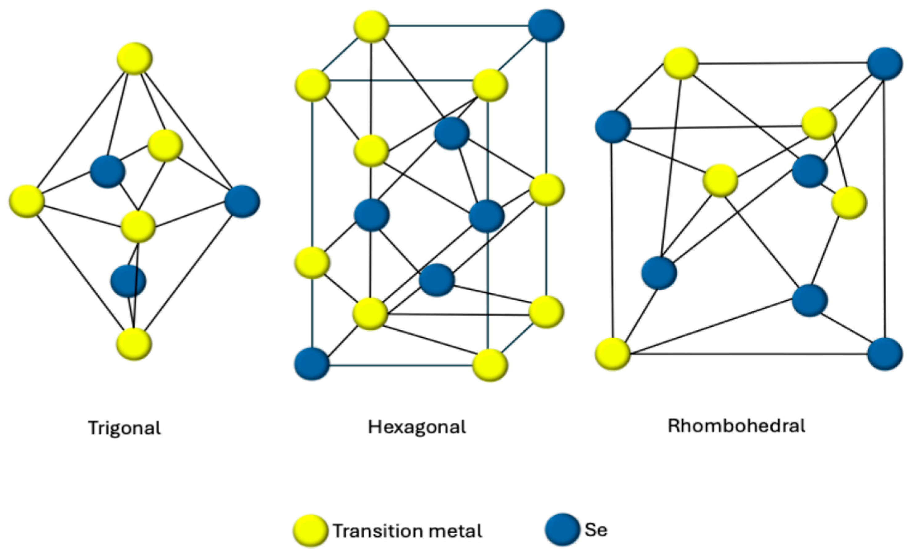 On the other hand, the crystal structure of transition metal diselenides (TMDSes, MSe2) can be classified into layered and pyrite structures. Generally, when M is a transition metal from groups IV–VI of the periodic table, the favored structure is the layered one, while, in the case where the transition metal M is from groups VII–VIII of the periodic table, the favored structure is the pyrite-type crystal [71]. There are notable differences between these two structures; particularly, layered structures display significant anisotropies in their electrical, chemical, mechanical, and thermal properties [72,73], unlike the cubic symmetry of pyrite structures. Additionally, the bonding of Se-M differs in these two structures, as Van der Waals interactions are observed in the layered structure, while, in pyrite structures, covalent interactions prevail [71]. As indicated by Figure 1, these materials exist in various crystalline phases, the primary ones being trigonal, hexagonal, and rhombohedral [74].
